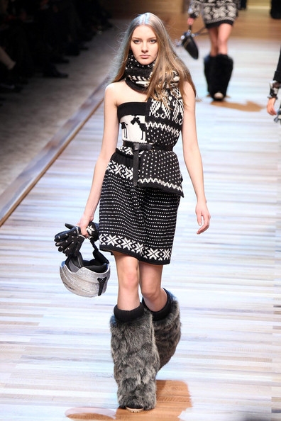 Réchauffée par d'opulentes Moon Boots de fourrure (qu'elle ne quittera pas de tout le show), la fille D&G s'autorise alors body en tricot, mini short edelweiss, micro robe pull ainsi que bustier tricoté sur jupe en dentelle...