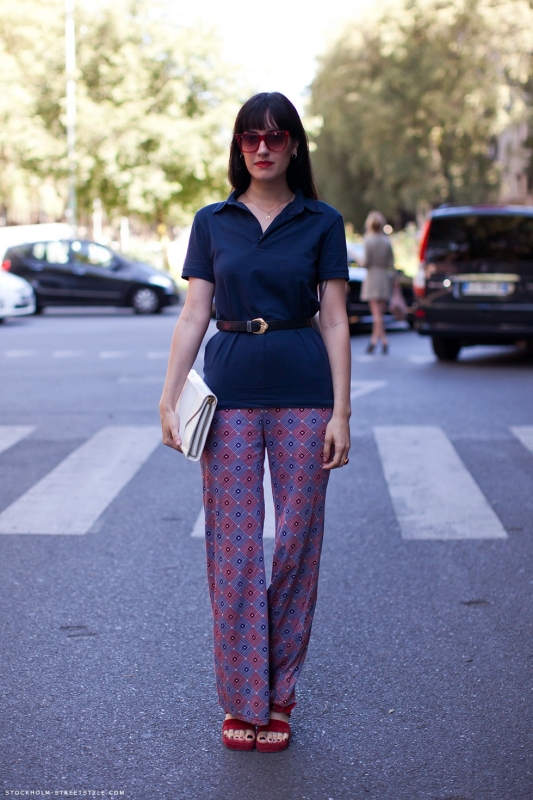 En associant son splendide pantalon foulard Tommy Hilfiger à un trench court et déboutonné, Joanna Hillman - Harper's Bazaar - ne parvient ainsi qu'à casser l'harmonie de sa silhouette, l'équation "large sur large" amoindrissant considérablement l'impact de la pièce pivot de son look (qui aurait gagné à se voir mariée à un top cropped ou un micro pull). De son côté, cette jeune femme en pantalon seventies - visiblement trop court et trop étroit - ne réussit pas à enrayer l'effet "homewear" de ce genre de pièces.