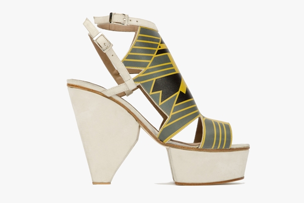Viennent ensuite des modèles plus exigeants, au sein desquels volumes et jeux de matières s'allient pour composer d'insolents objets shoesesques. On pense notamment à ces sangles bi-matières et autres empiècements de cuir à la saveur amérindienne s'accompagnant de semelles surdimensionnées, de talons de forme pyramidale inversée et d'audacieux patins.