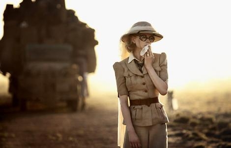 Directement inspiré de l'Australie coloniale des années 20, le vestiaire Rodarte puise ses références aussi bien au sein de la garde-robe de Nicole Kidman dans le film "Australia" qu'au coeur du patrimoine aborigène. Naissent alors des toilettes de jours rétro à l'allure pudique (dont les teintes sable se voient agrémentées de carreaux délavés et de cols en dentelle aristo) ainsi que des vestes à larges revers ceinturées haut sur la taille (qui ne sont pas sans évoquer les tenues de brousse de quelques amazones britanniques venues explorer le territoire australien).