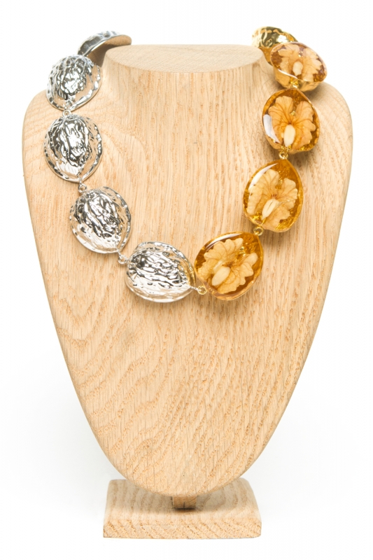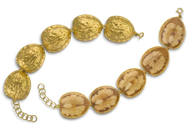Pour sa première collaboration avec la griffe Kenzo, la fille de Silvia Venturini Fendi n'hésita pas à mettre de côté son goût prononcé pour les vanités au profit d'un champ lexical un brin moins onirique que d'ordinaire. Quand Aurélie Bidermann fige dentelle ancienne et plumes légères dans de l'or 18 carats, Delfina Delettrez décide ainsi d'immortaliser cerneaux de noix et quartiers d'orange séchée au sein d'une résine translucide.