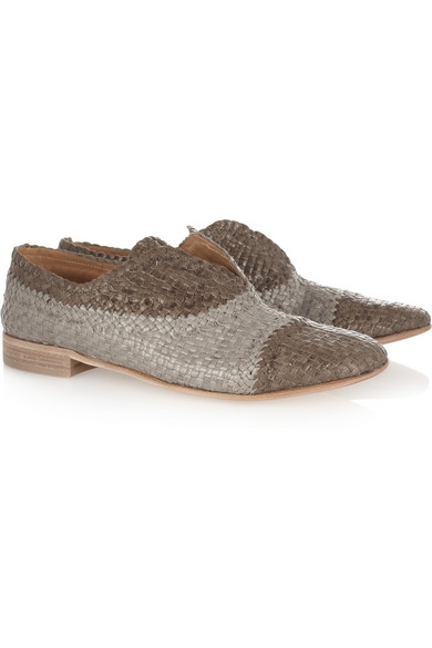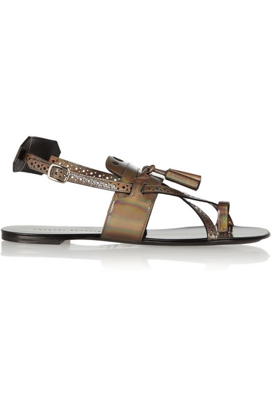 Celles pour qui les robes et autres trenchs Quality Street de chez Burberry Prorsum restent hors de portée ne devront pas hésiter pas à faire pétiller leur allure printanière par le biais de sandales, ballerines et autres mocassins métallisés (babies Miu Miu, nu-pieds Pierre Hardy, tabis Maison Martin Margiela) Compagnon idéal des teintes pastel du moment, le fluo infuse cette saison bon nombre de souliers (Charles Philip Shanghai) L'été étant propice aux fantaisies folkloriques, on n'hésite pas à succomber au mix strass/studs des sandales Isabel Marant ainsi qu'à la dégaine Masaï de ces "Ancient Greek Sandals" Rien de tel pour flirter avec l'air du temps que d'opter pour une paire de sandales deux tons (voir ici et là), surtout lorsque celles-ci se déclinent dans des textures différentes (Stella McCartney, Nicholas Kirkwood) Les brogues se portent sans lacets (Rag&Bone, Maison Martin Margiela) Afin d'honorer comme il se doit la tendance mix and match d'imprimés, on n'hésite pas à accompagner nos marinières d'une paire de souliers rayés (Repetto, Roger Vivier, Marc Jacobs) Si l'on en croit Phoebe Philo et Marc Jacobs, sandales et mocassins fourrés seront parfaitement d'actualité cet été Aussi peu esthétique soit-elle, l'épaisse semelle en caoutchouc crantée tente de s'imposer comme un détail must have (Alexander Wang) Les brogues lèguent leurs pompons aux sandales (Proenza Schouler) Entre slip-on façon Vans et Air Max Vintage, les fans de sneakers ont l'embarras du choix Les souliers d'allure masculine prennent leurs quartiers d'été en optant pour un design ajouré (Asos, Alexander Wang, 3.1 Phillip Lim)