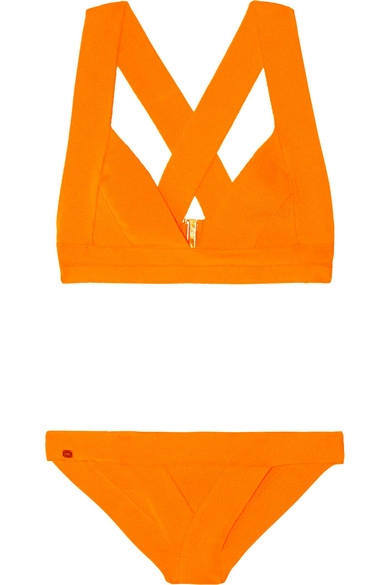 Si les robes bandages Hervé Léger n'ont pas leur pareil pour sublimer les courbes des actrices hollywoodiennes, les maillots de bain de la griffe américaine - qui reprennent tout le système de bandes gainantes - promettent quant à eux un maintien optimum et une allure de James Bond girl à toutes celles pouvant se permettre de dépenser 637 euros dans un bikini. Hautement désirable, le modèle orange vitaminé flattera particulièrement les bronzages pain d'épice.