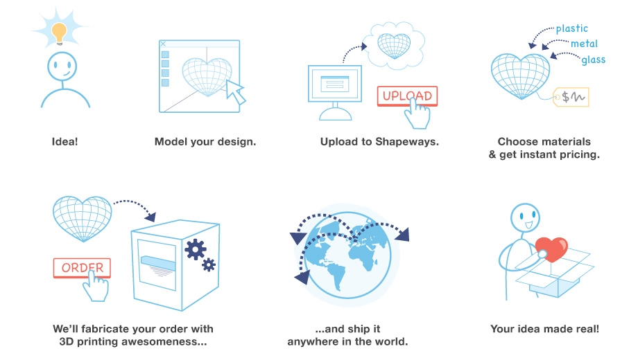 Dans un premier temps, la conception via internet de pièces 100% personnalisées - à l'instar de ce qui se fait déjà chez Shapeways - devrait se démocratiser. Les plus créatifs dessineront eux-mêmes leurs pièces, tandis que les autres se contenteront de reprendre des modèles prédéfinis et d'en modifier les principaux paramètres (taille, couleurs, etc).