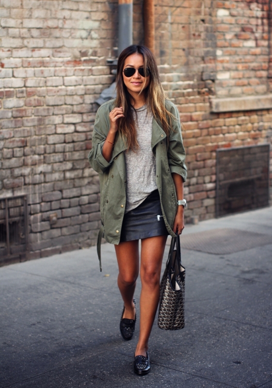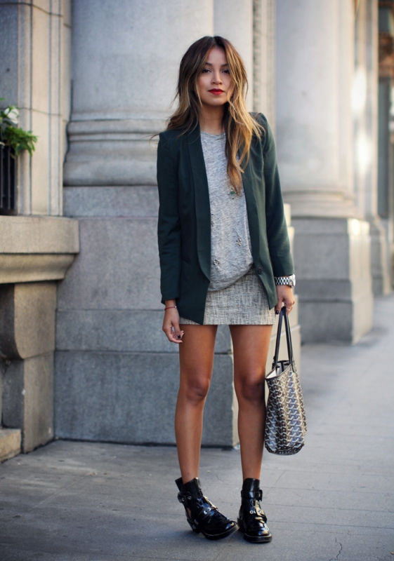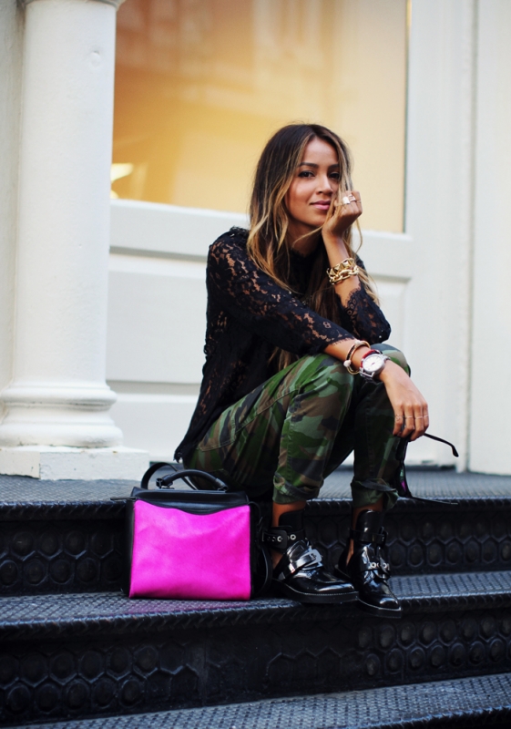 Dans la pratique, celles qui voudront s'inspirer de la jeune femme pourront ainsi : Apaiser leurs mini-jupes en les associant à un pull en grosse côte anglaise, au trio tee-shirt loose/blazer long/boots masculines ou encore à l'ensemble chemise légère à carreaux/tee-shirt loose/collier bohème-bling (voir ici, ici et là). Dérider leurs petites robes noires au contact d'un maxi foulard écossais ou d'une veste kaki (voir ici et là). Adoucir la dégaine destroy de leurs shorts en jean en les mariant au mix blazer imprimé/tee-shirt loose/baskets blanches/boucles d'oreilles baroques (voir ici). Tenter le télescopage dentelle noire/imprimé camouflage (voir ici).