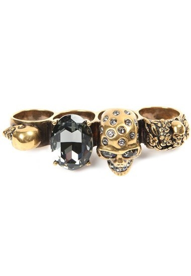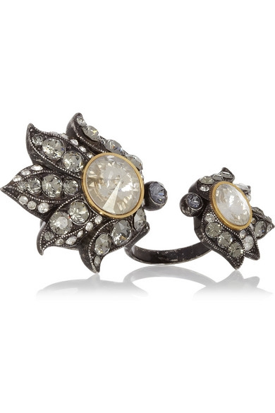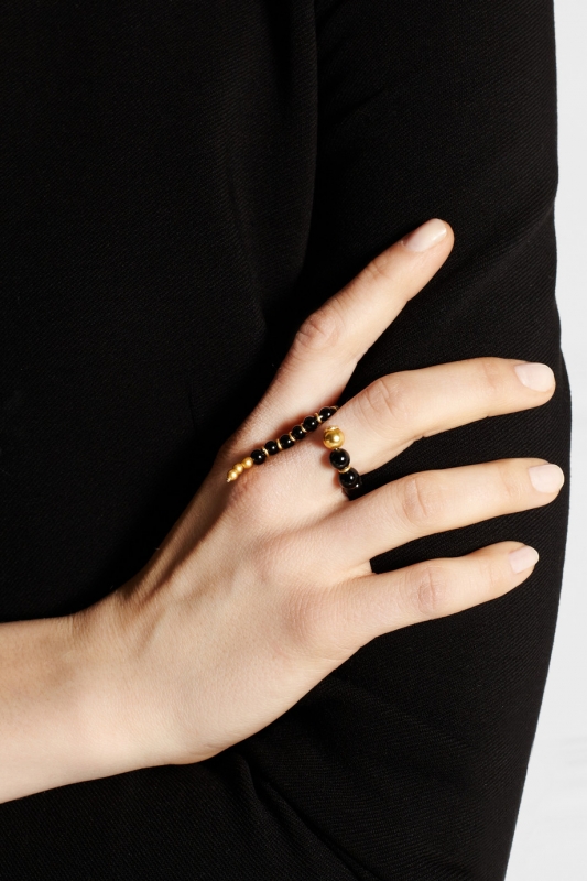 On note également la présence de modèles n'enserrant que deux doigts. Des modèles qui pourront soit jouer la carte de l'opulence en arborant pierreries ostentatoires (Salvatore Ferragamo, Lanvin) ou débauche de brillants (Swarovski), soit miser sur une certaine épure, comme chez Pamela Love (où les deux bagues servent de support à une fine barre ornée d'une unique perle) ou chez Jennifer Fisher (où une mono bague crée une subtile illusion d'optique).