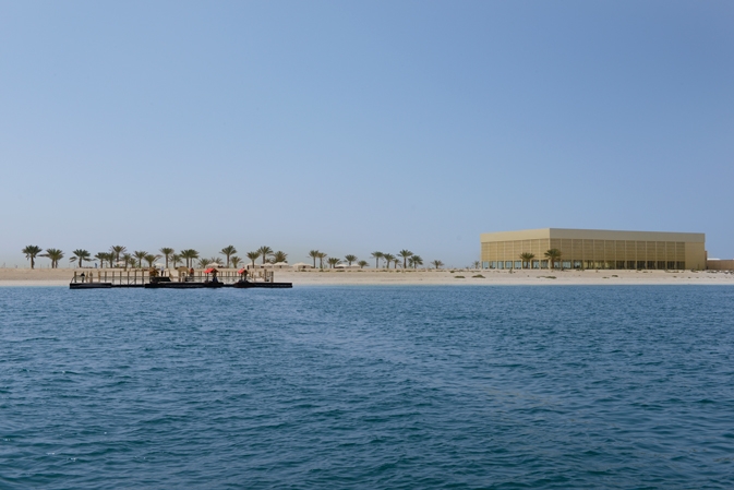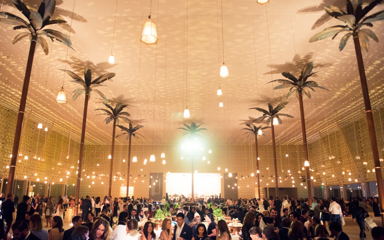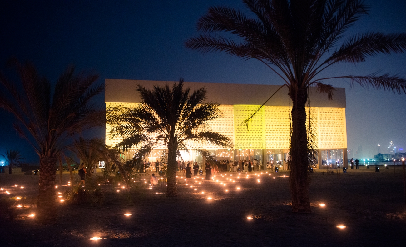 Une île artificielle sur laquelle a été construit - spécialement pour l'occasion - un immense bâtiment carré à la façade constituée d'une multitude de doubles "C" entrelacés. À l'intérieur, des lanternes suspendues, des palmiers et des coussins blancs disposés autour de tables basses.