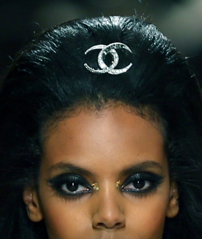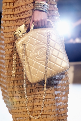 Karl Lagerfeld a pris l'habitude de traiter les accessoires de ses collections sur un mode très premier degré. C'est ainsi que les Crystal Renn, Binx Walton et autres Lindsey Wixson arborèrent diadèmes sertis d'un croissant de lune (évoquant aussi bien l'esthétique du Moyen-Orient que le "C" de Chanel), éventails brodés, babouches, bijoux fantaisies clinquant et minaudières maxi perle (clin d'oeil à l'opulence doubaïenne). Sans oublier les déjà fameux sacs jerricans…