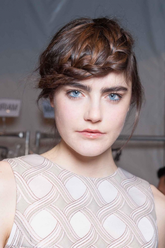 Je suis impressionnée par ma vigueur capillaire : jamais je n'aurais cru que ma frange se transformerait si vite en longue mèche. N'osant pas la couper moi-même et n'ayant pas le temps de passer chez le coiffeur, je me retrouve néanmoins chaque matin confrontée au même problème : comment gérer ces cheveux qui ne tiennent pas dans un chignon et qui m'obscurcissent totalement la vue quand ils ne sont pas attachés ? En cherchant des idées sur la toile, je tombe sur cette photo du défilé Creatures of the Wind. Je décide alors de tresser ma frange en partant de l'extrémité droite vers le coté gauche en collant au crâne. Résultat : une petite tresse africaine esprit "demi-couronne de tresses" qui me permet de repousser l'échéance du coiffeur.