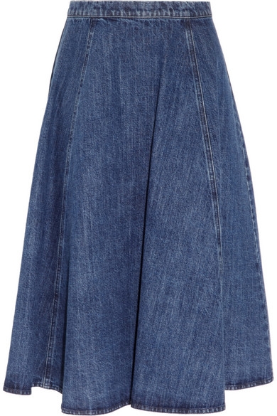 Conjuguant taille légèrement haute, godets amples, longueur sous genou et toile de jean indigo, celle-ci renouvelle en effet avec brio le stéréotype de la jupe jupe midi à panneaux. Oublié ainsi le style "dadame" souvent indissociable de ce genre de volumes : l'usage d'une matière plus familière des cowboys que des jolies dames débarrasse ladite jupe de toute sophistication superflue.