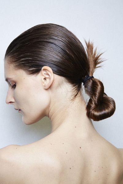 Fusion entre chignon, effet "wet" et torsade, le hair code du défilé Céline nous propose de nouer nos cheveux mouillés en queue de cheval, de la torsader et de l'attacher à la base de l'implantation des cheveux, avant d'épingler son extrémité sur le côté du crâne. Le résultat variant en fonction de la masse de cheveux (voir ici et là), on réservera ce look "sortie de douche" à celles possédant une chevelure dense.