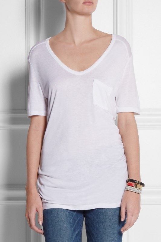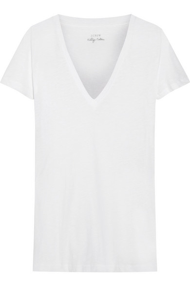 Après moult recherches, essayages et déceptions post-lavages, il s'avère que le parfait tee-shirt col V ne se trouve ni chez American Apparel (col pas assez généreux), ni chez T by Alexander Wang (poche inutile), ni chez Urban Outfitters (mauvaise résistance au lavage), ni chez Zara (les bons modèles disparaissent d'une saison à l'autre), ni chez Gap (la texture dévorée du tee-shirt devient trop rapidement transparente), ni chez The Row (prix trop élevé), mais plutôt chez... J.Crew.