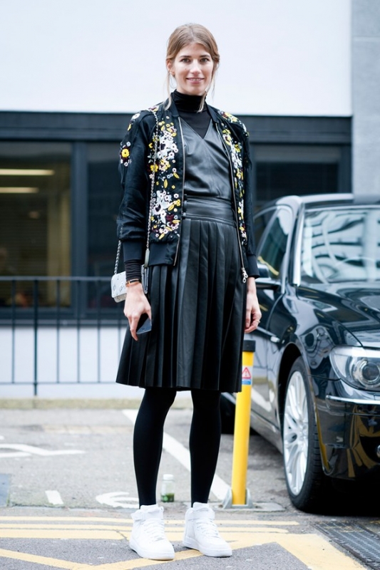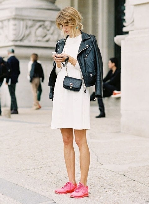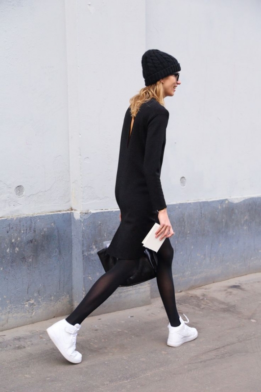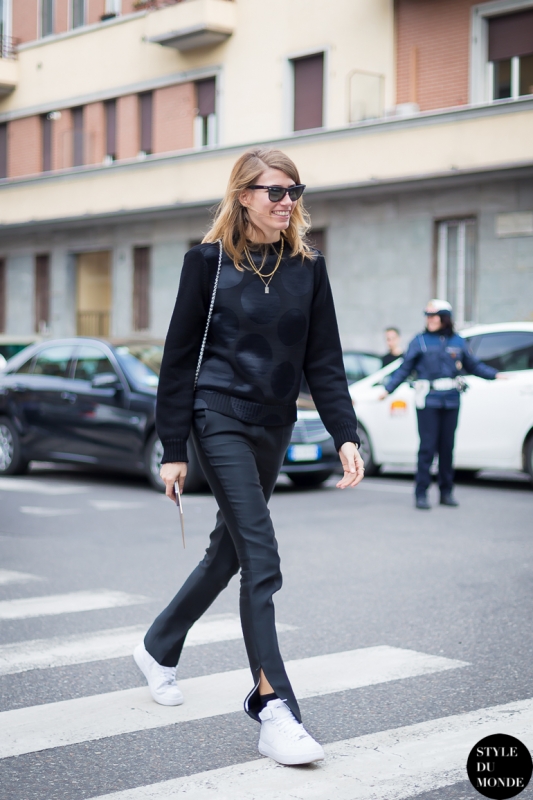 Mixer tennis blanches et total look noir, afin de décliner en mode sportswear le très chic duo noir et blanc (voir ici et là). Arborer régulièrement des cheveux à peine coiffés, de manière à apaiser les looks les plus féminins.