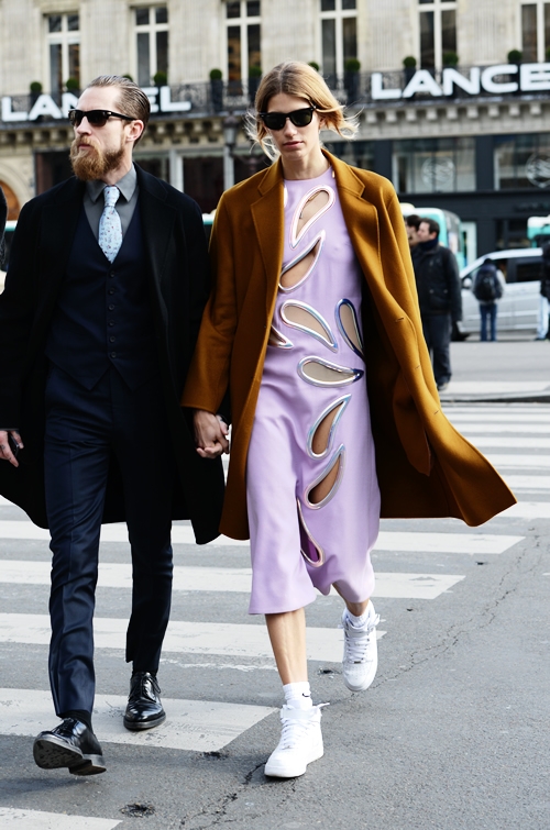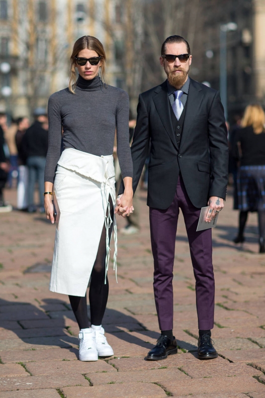 Apaiser ses robes créateurs à coups de chaussettes à virgule (voir ici et là). Marier pantalon taille haute sophistiqué et simple tee-shirt noir. Décasualiser le trio sous-pull/tennis/collants opaques en lui associant une jupe sensuelle. Avoir toujours une paire de tennis à proximité pour accompagner ses tenues chics. Équilibrer l'aura féminine d'une jupe droite ou d'une robe de cocktail au contact d'une paire de bottines Doc Martens (voir ici et là).