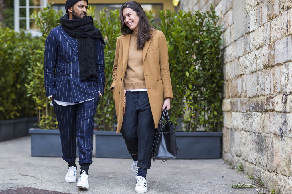 Rien de tel qu'une touche d'orange pour réveiller le duo chocolat/camel. Travaillés dans les mêmes teintes, imprimés pied-de-poule et rayures horizontales se marient pour le meilleur. On pense à accompagner nos jeans bruts du mix pull col roulé noir/veste brou de noix/brogues carbone. Stan Smith et petit sac Chanel continuent de faire bon ménage. La chaussette de sport fait de la résistance. Rien de tel qu'une paire de lunettes de soleil racée pour égayer les superpositions hivernales.