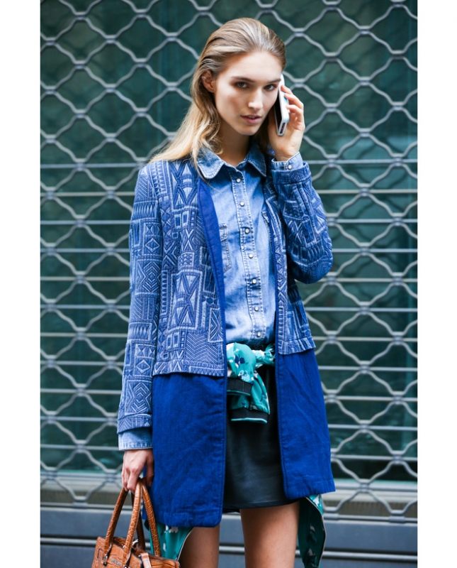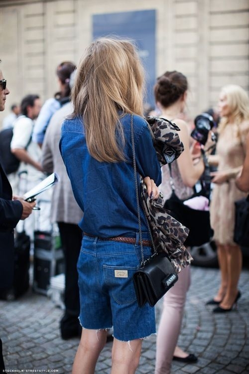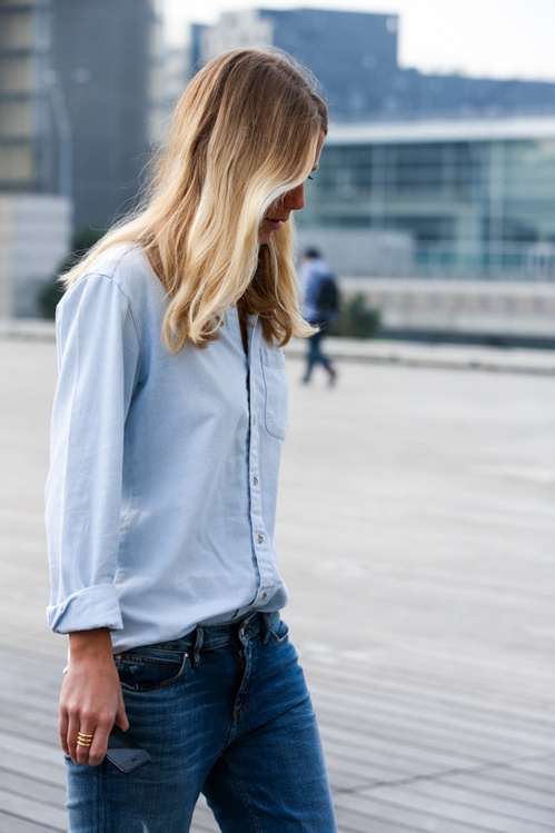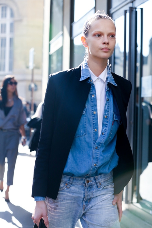 À ces variations stylistiques un brin trop banales, on préférera sans hésiter le look de cette mannequin ayant astucieusement superposé deux chemises (l'une en denim, l'autre blanche), celui de cette jeune femme réchauffant d'un trench camel le duo short/chemise en denim délavé ou encore celui de Jennifer Neyt qui, en optant pour un jean droit brut, une bague Gaia Repossi et une chemise en jean ultra clair roulottée sur le poignet, conjugue la tendance sur une efficace note casual.
