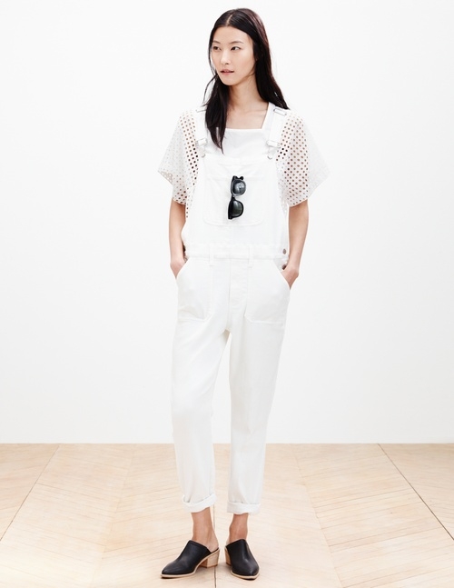 Déclinée en blanc immaculé, la salopette aimera adopter un look ton sur ton. Elle se portera alors roulottée sur la cheville avec un top texturé (qui permettra de jouer sur le contraste des matières) ou une chemise (que l'on déboutonnera largement) et s'accompagnera aussi bien de souliers plats (carbone ou fauve) que d'escarpins. Sa version short se choisira de préférence dans un volume légèrement oversize, que l'on chicisera à coup de micro sac noir et de lunettes de soleil pointues.