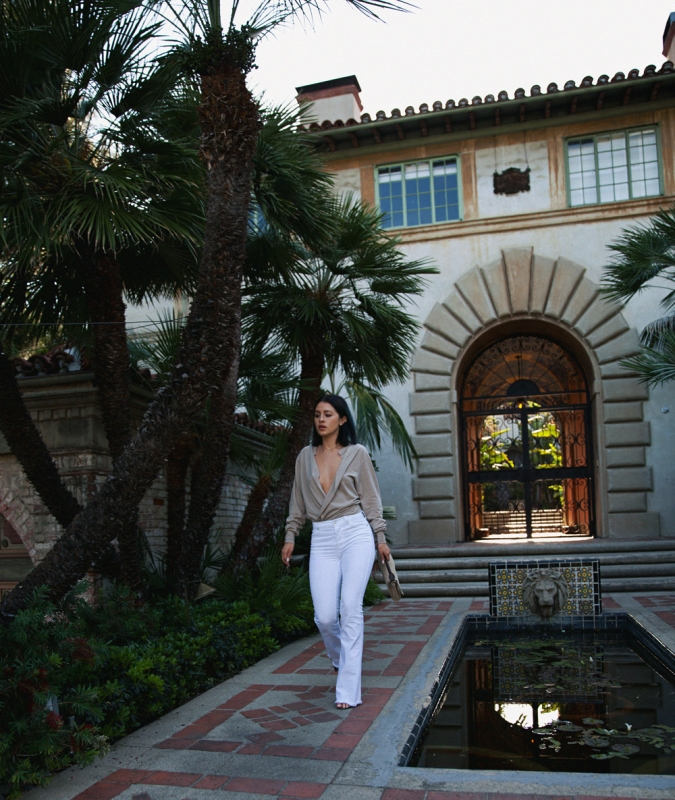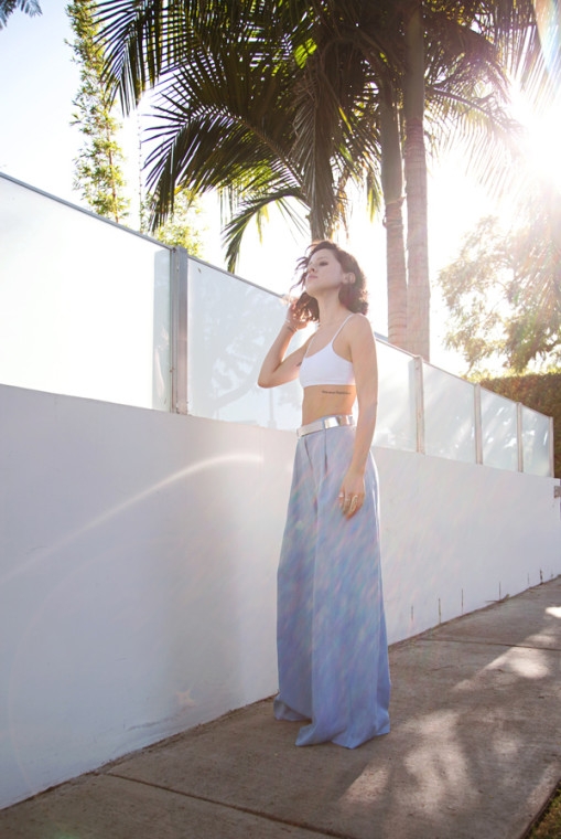 Le look maillot de bain et pantalon large avec large ceinture le montre bien.