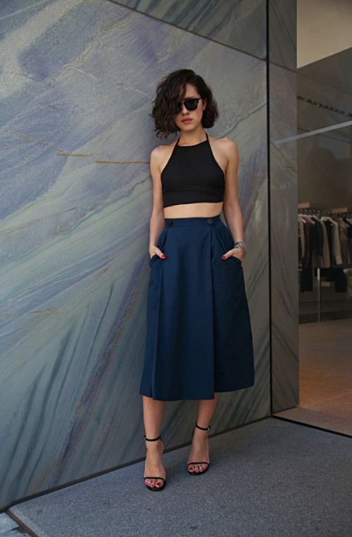 Accentuer la sensualité d'une chemise en la portant croisée, déboutonnée et glissée dans un bas taille haute (voir ici, ici, ici et là). Booster un top noir légèrement sexy via un trait d'eye-liner (voir ici). Déjouer les risques de la longueur 7/8 en la portant avec des sandales à lanières hautes perchées (robe Shareen Vintage et sandales Rupert Sanderson). Marier bijoux sophistiqués et tee-shirt destroy (BO Leith). Télescoper sweat roots et jupe fourreau (voir ici). Oser en soirée le duo veste de smoking/soutien-gorge bandeau texturé (Prada). Marier jean droit taille haute, escarpins et body noir décolleté (Nastygal). Télescoper jupe midi texturée et top à peine cropped (voir ici). Oser le contraste pantalon taille haute ultra large/brassière minimaliste (voir ici). Glisser un pull moulant col roulé dans un slim brut taille haute et marier le tout à une paire d'escarpins noirs (voir ici).