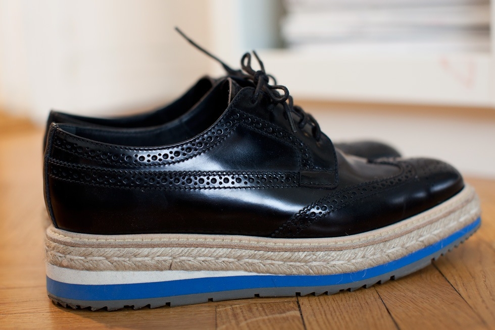 Oui mais voilà, aujourd'hui les rues sont propres et les designers ont à leur disposition tous les matériaux qu'ils souhaitent. Autrement dit, le choix de proposer des semelles à la Prada est ici purement "stylistique". Et si en version brogues, ce concept put par le passé se révéler séduisant, il en va tout autrement lorsqu'il s'agit de sandales, le mix brides/pied dénudé/semelle infiniment épaisse - plus de 3 cm - s'avérant déséquilibré et peu ergonomique (voir ici, ici et là).