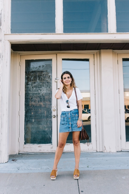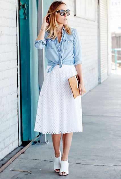 On n'hésitera ainsi pas à jeter notre dévolu sur un tee-shirt près du corps (ou à large col V), que l'on mariera aux stars de la saison que sont la jupe trapèze boutonnée sur le devant et les converses basses blanches. Simple et efficace, ce look n'aura alors besoin que d'un trait de lipstick effet bouche mordue pour se frayer dignement un chemin au sein de la jungle urbaine. On pourra également opter pour (ou non), une jupe midi ligne A, un tee-shirt cropped un brin ample ou un body.