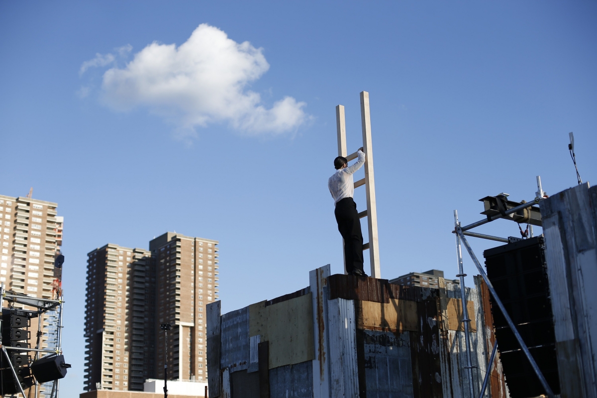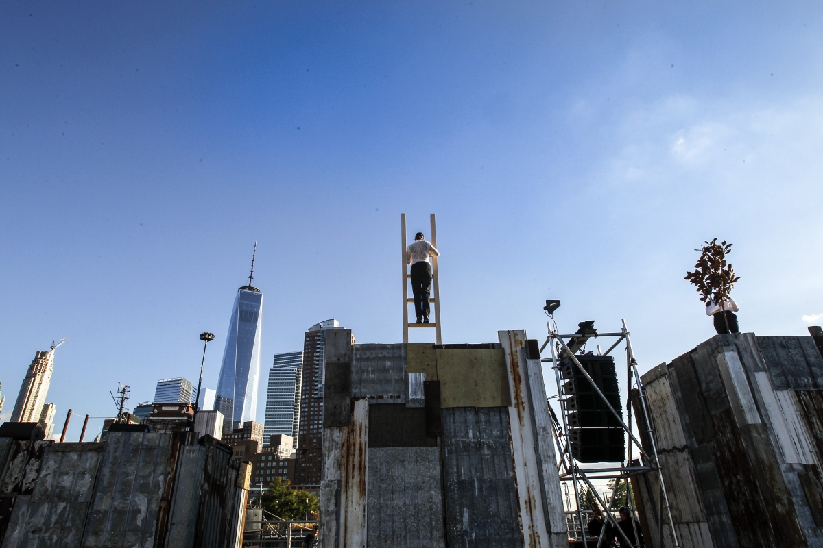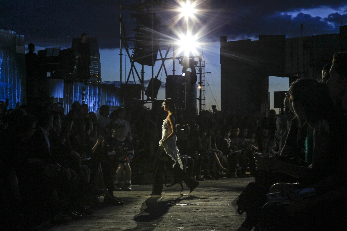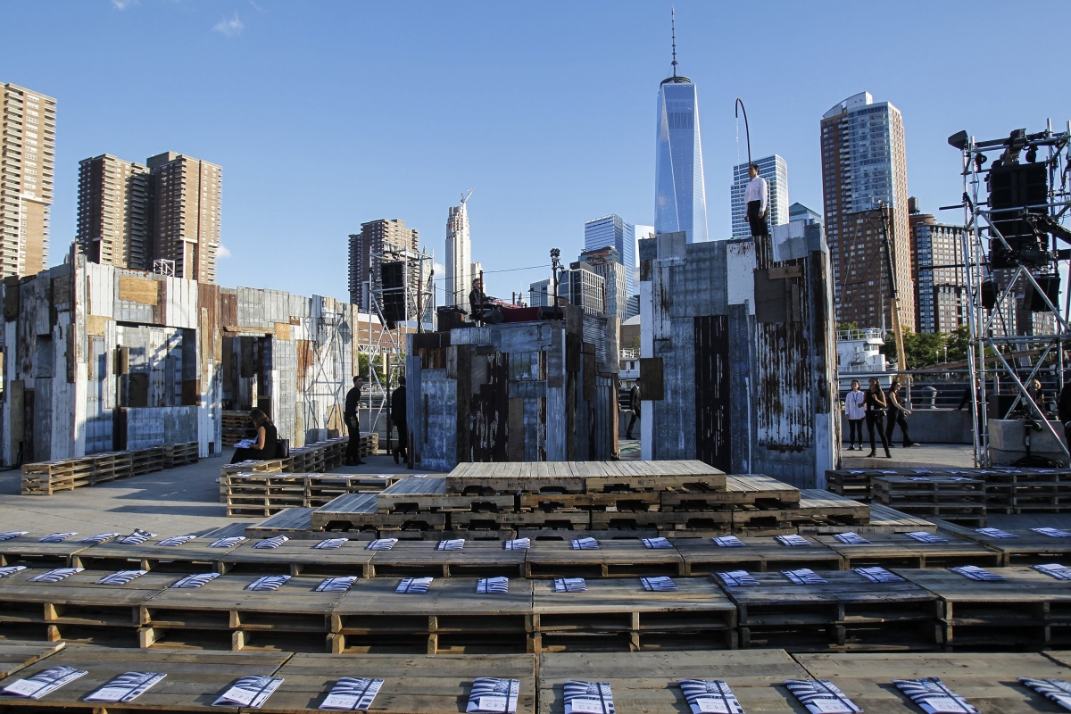 En guise de cimaise, Riccardo Tisci a choisi le Pier 26, une jetée sur l'Hudson depuis laquelle on peut apercevoir la Freedom Tower. Entre tôles oxydées et palettes de bois, le décor en plein air érigé au bord du fleuve avait tout d'un bidonville. Bidonville où l'on put apercevoir outre des mannequins déambulant à la lueur du coucher de soleil new-yorkais, des artistes performeurs donnant naissance à des scènes des plus conceptuelles (voir ici, ici et là).