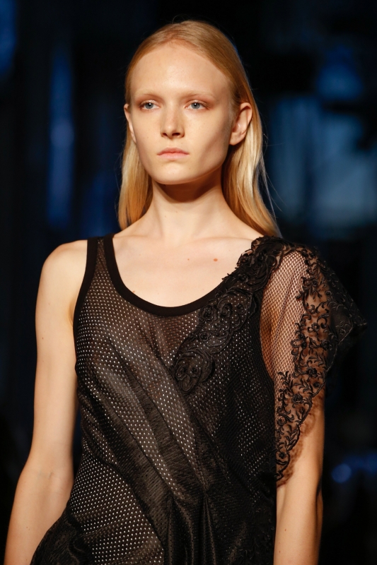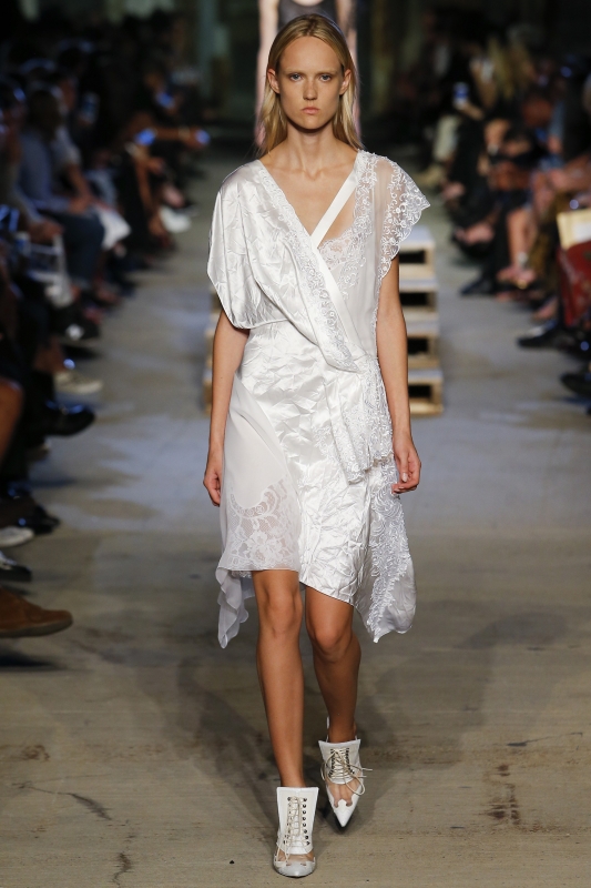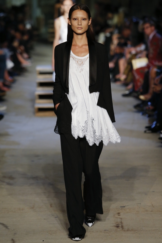 Travaillée essentiellement en noir et blanc, la collection reprend les gimmicks chers à Riccardo Tisci : détails sportswear et lingerie fusionnent, robes et autres blouses se taillent dans des aubes de première communiante 1900, drapés et bandes de satin nouées à la va-vite habillent épaules et corsages, asymétrie et dentelles se télescopent, tandis que les smokings masculins troquent leurs chemises à plastron contre des déshabillés sensuels (voir ici et là).