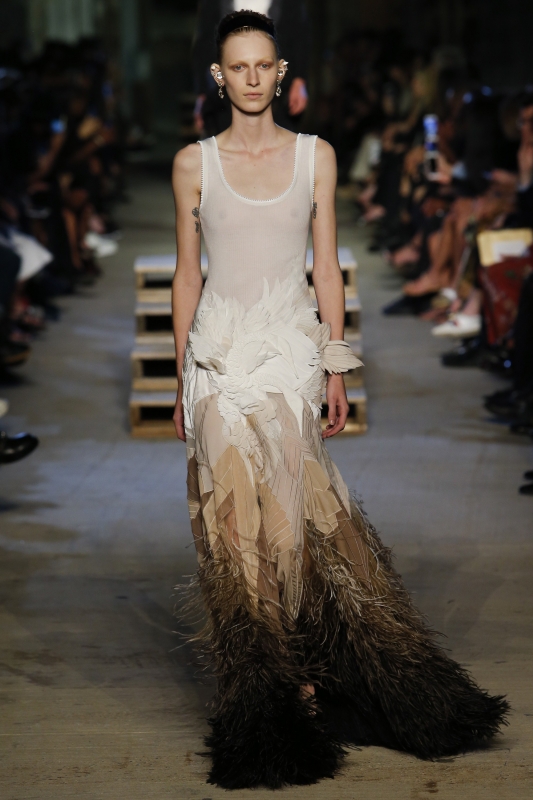 Si par le passé la femme Givenchy a pu afficher une assurance quasi guerrière, elle se révèle ici presque fragile, vulnérable. Sur le catwalk, ses audaces esthétiques se muent par ailleurs en élégance quasi universelle, tandis que son vestiaire se recentre sur le coeur de l'ADN Tisci/Givenchy...