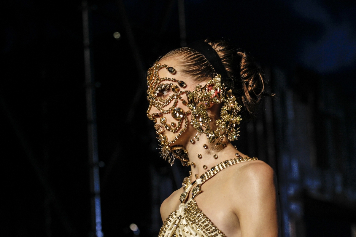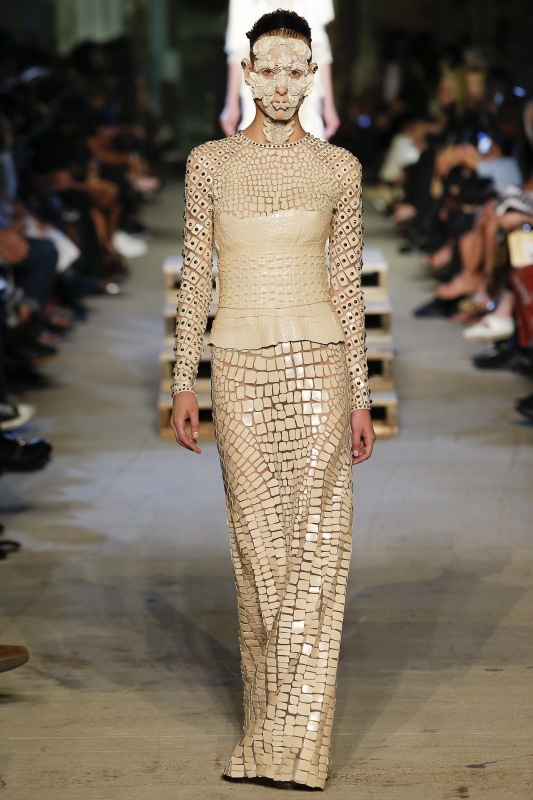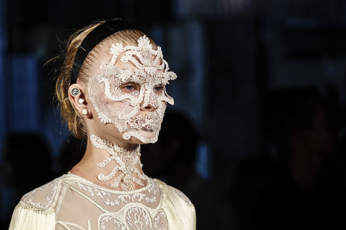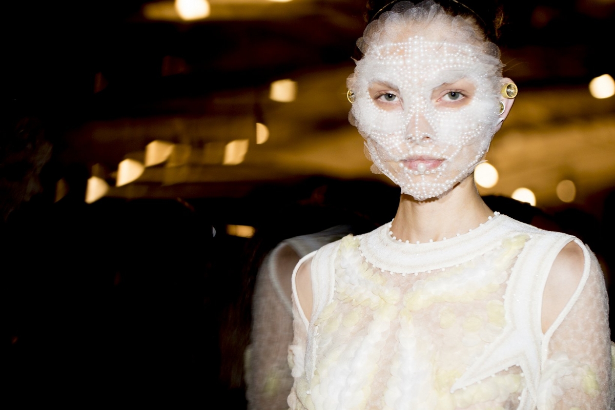 Si la plupart des mannequins défilèrent le visage quasi dépourvu de maquillage, une petite poignée d'entre elles arborèrent des masques faciaux aux allures de parure mutante pour déesse néo-moderne (voir ici, ici, ici et là).