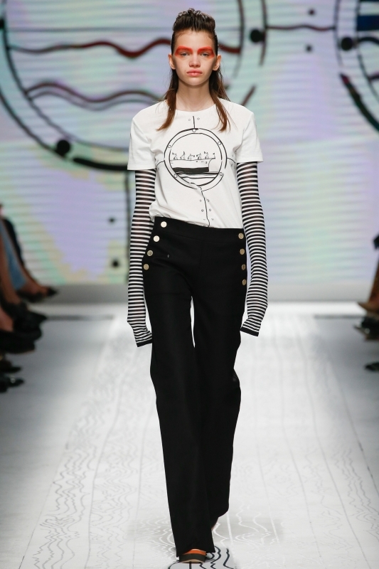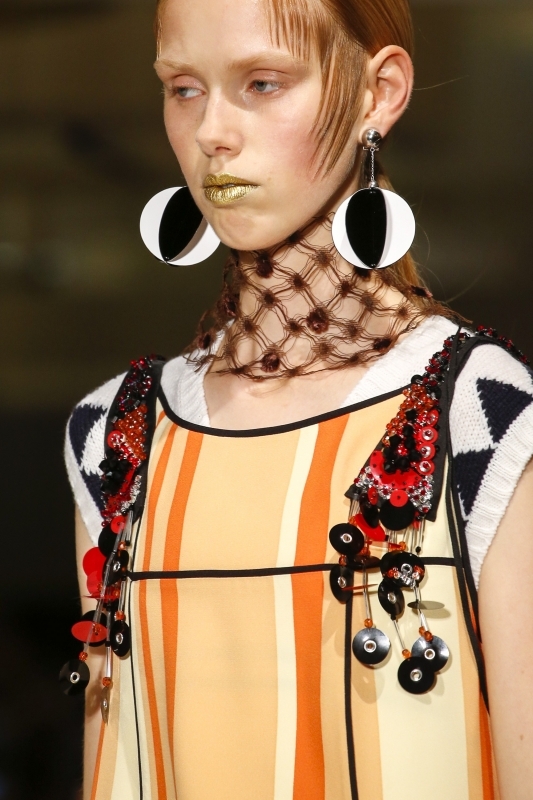 Affichant toutes une chevelure ultra courte, la top Ruth Bell et les jumelles Giulia et Camilla Venturini pourraient bien offrir une nouvelle désirabilité à la coupe de Sinead O'Connor. Entre immenses créoles camouflage chez Versace, larges sphères à pétales chez Prada, généreuses fleurs fluo chez DSquared2 et bijoux seventies longuissimes chez Gucci, l'humeur semble être plus que jamais aux boucles d'oreilles oversize. Point fort des collections printemps/été 2015, le gimmick du laçage joue les prolongations chez Fendi. Et s'il apparaît un brin premier degré sur les parures guerrières des modèles (voir ici et là), il se révèle des plus contemporains sur la maroquinerie de la griffe (voir ici et là). Chez Marni, Consuelo Castiglioni emprunte sa palette de couleurs à l'univers du Lego (voir ici). Cet automne, on continue de porter nos tee-shirts de hard rock ! (voir ici). Naomi Campbell et Riccardo Tisci vinrent applaudir le show Versace (voir ici). Chez Gucci, les actrices, "it" girls et mannequins affichèrent leur allégeance à Alessandro Michele en arborant ses insolentes créations rétro (voir ici, ici et là).