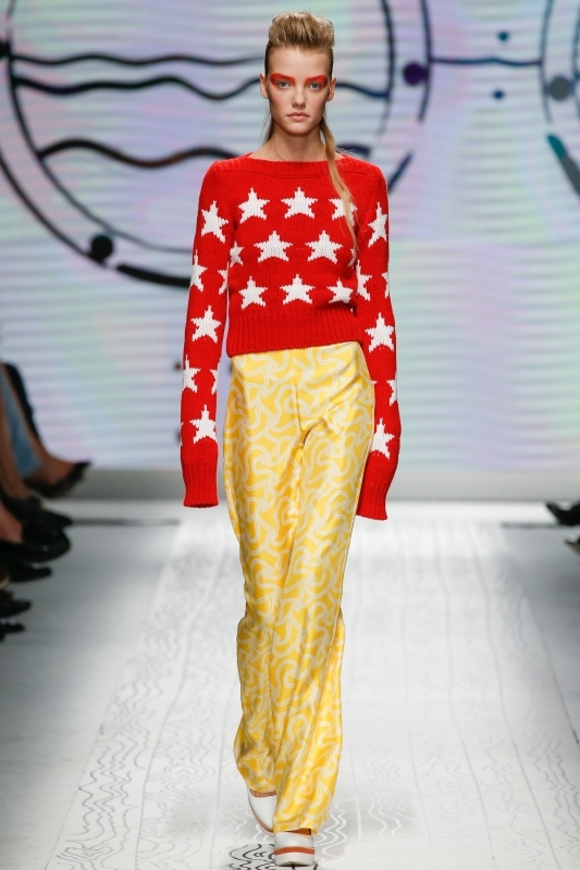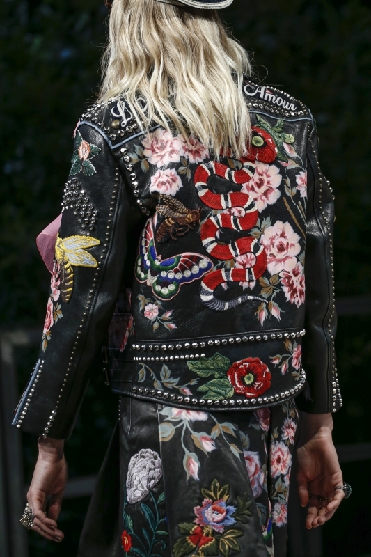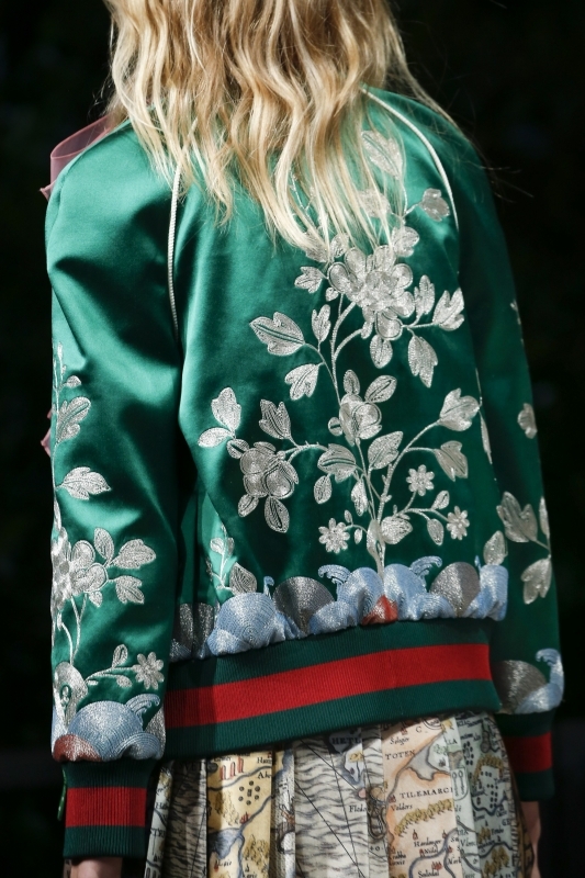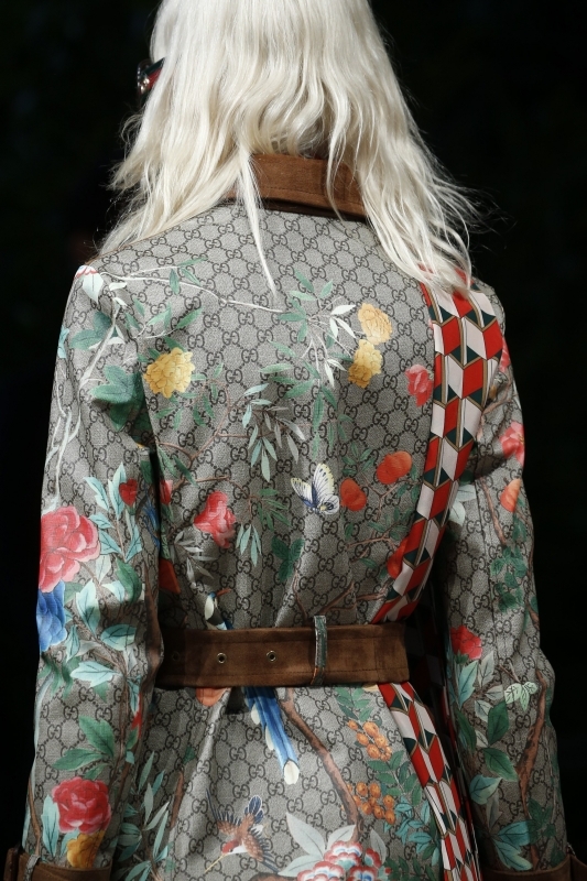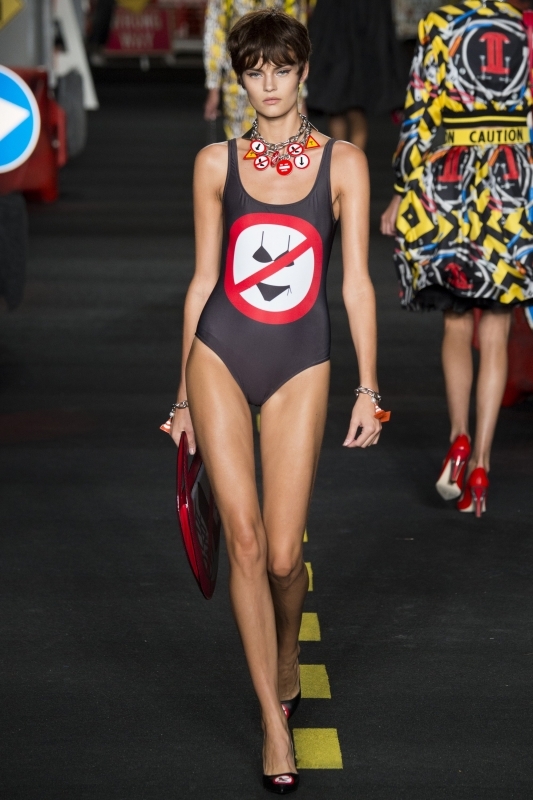 Aussi insolite soit le dress code Gucci, force est de constater que la collection italienne est riche en pièces fortes à la sophistication certes outrancière, mais non moins désirable. On pense notamment à ce blouson teddy en satin brodé et aux bords côtes aux couleurs de la griffe, à cet incroyable perfecto ou encore à ce trench en toile Gucci peinte de délicates fleurs. Sans parler des sacs revisitant avec brio l'imagerie Gucci (voir ici, ici et là) et de cette ceinture un brin bling-bling mais néanmoins infiniment attirante. Si l'on en croit Gucci, les bagues se portent désormais sur des mitaines (voir ici). Oubliés cigarettes, iPhones et autres objets nécessitant l'usage de ses doigts : l'humeur de la saison est aux manches ultra longues dissimulant totalement les mains (Max Mara). Rarement un créateur ne se sera autant amusé que Jeremy Scott chez Moschino. Ici, pas de références intellos, mais de multiples clins d'oeil à la pop culture qui donnèrent naissance à des pièces à la bonne humeur jouissive et au mauvais goût assumé. Parions d'ailleurs que les maillots une pièce imaginés par le trublion yankee - voir ici et là - feront partie des must have de l'été prochain... Nouveau directeur artistique de la griffe Roberto Cavalli, Peter Dundas livra une collection brouillon manquant de ligne directrice. De son côté, Massimo Giorgetti - nouveau DA de Pucci - ne fit guère mieux…