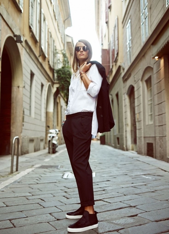 Le pantalon à pinces et de couleur beige avec le débardeur blanc = tuerie de simplicité et de chic