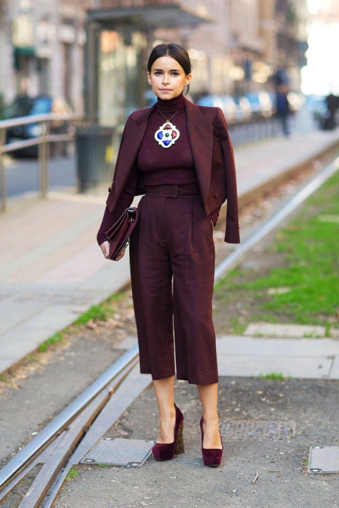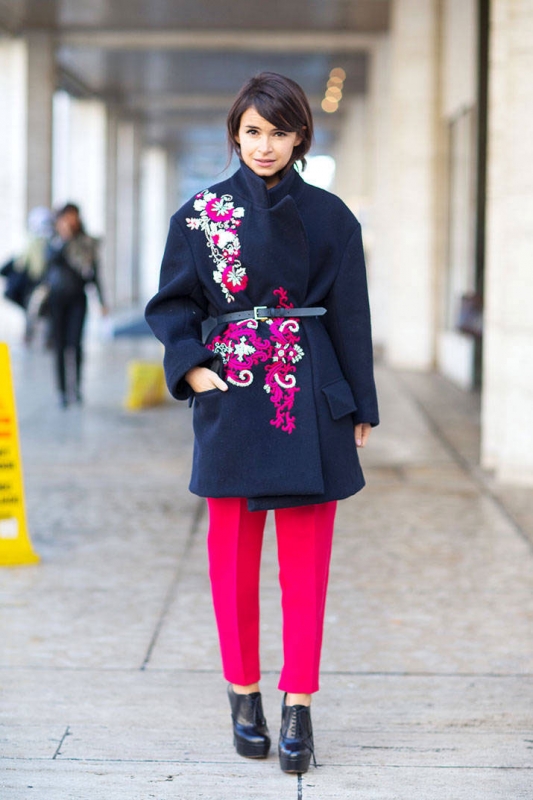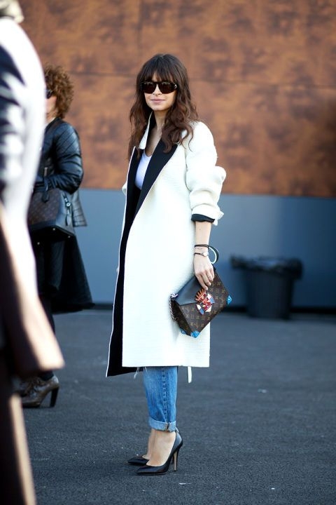 Choisir un manteau s'arrêtant au dessus du genou et le porter croisé et ceinturé taille haute (voir ici). Opter pour un pantalon droit, ⅞ et taille très haute, de manière à allonger la silhouette (voir ici). Associer taille haute et top court basculé vers l'arrière (voir ici). Utiliser une ceinture ultra large portée taille haute, afin de structurer la silhouette (voir ici, ici et là). Oser - en dépit de sa petite taille - le manteau long en contrebalançant son effet englobant via l'association col roulé montant haut sur le cou/chevilles nues glissées dans de vertigineux escarpins (voir ici).