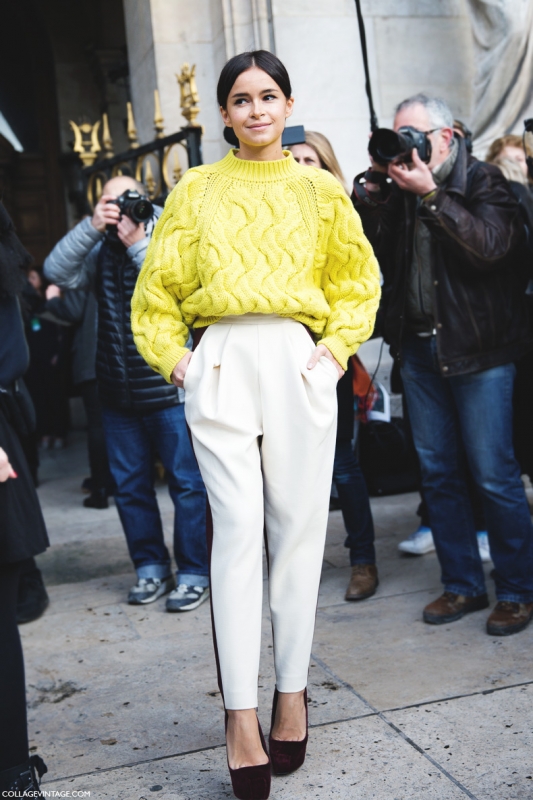 Contrecarrer la nature casual du jean boyfriend en lui associant un body scintillant à manches longues (voir ici). Porter ses bonnets à la manière d'une toque en fourrure (voir ici). Gagner en longueur de jambes en portant ses jeans/pantalons flare avec une paire de talons hauts perchés (voir ici et là). Miser sur le duo top étroit/jupe taille haute évasée (voir ici). Mettre en valeur son buste en mariant jupe posée sur les hanches et haut ultra moulant (voir ici). Profiter de la dimension cosy du pull torsadé sans pour autant se laisser ensevelir sous sa maille généreuse en le glissant dans un pantalon très taille haute (voir ici).