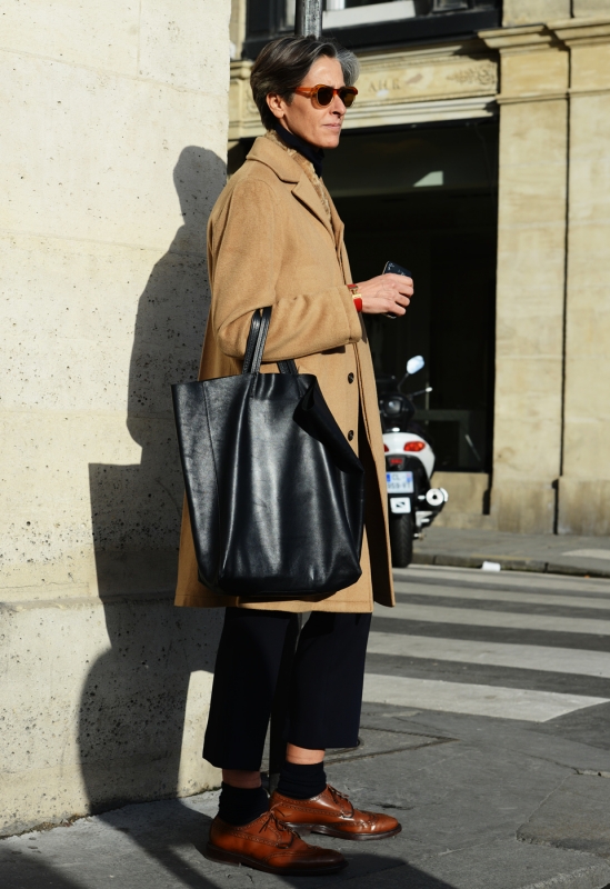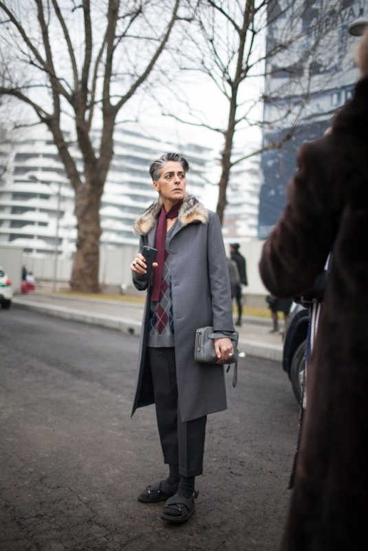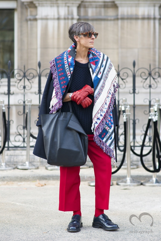 À part le pantalon 7/8ème court (beaucoup trop petite pour cela), j'adhère à tout. Sa façon d'associer les teintes est juste géniale. Et, je trouve que le mix féminin/masculin sied particulièrement aux femmes matures comme moi.