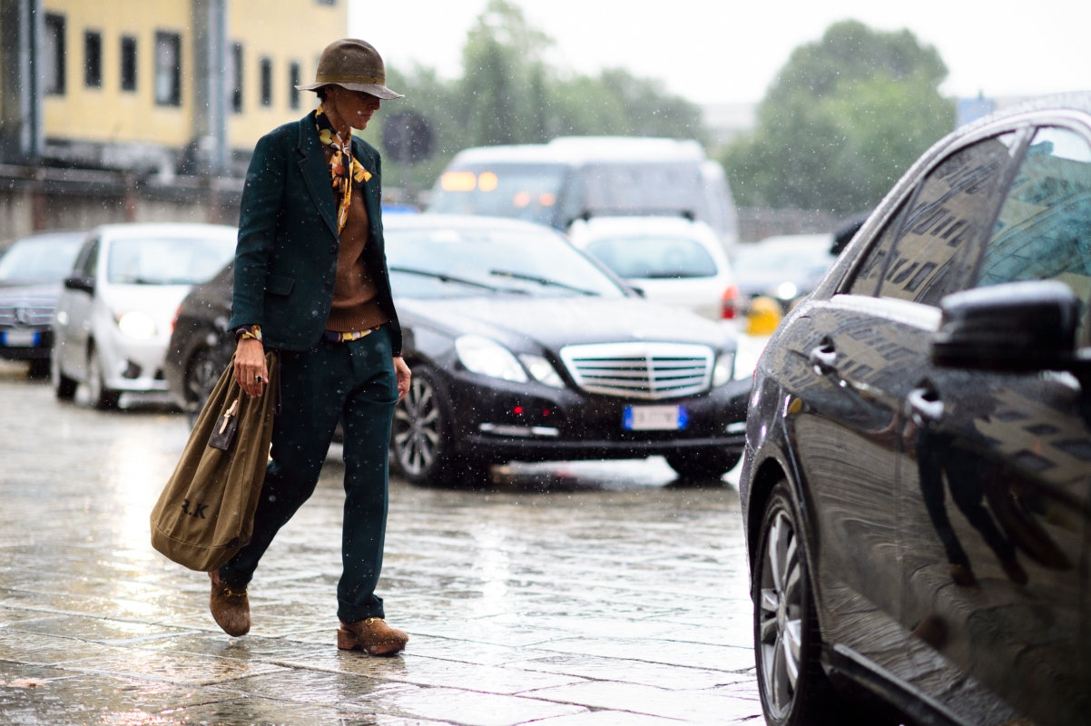 Marier sobre blazer masculin et châle tricoté coloré. Dédramatiser un look chic imprimé en lui associant des baskets ton sur ton (voir ici). Glisser un pull fin un brin ample sous une sur-chemise boutonnée sur le haut. Miser sur d'audacieux camaïeux de teintes (voir ici). Opter pour un manteau de demi-saison ressemblant subtilement à une robe de chambre chic (voir ici). Accentuer la verticalité de la silhouette en portant des pantalons légèrement larges munis d'une bande verticale (voir ici). Préférer au parapluie un chapeau imperméable (voir ici). Nouer un fin foulard façon cravate sur le côté du cou (voir ici). Oser le total look large en misant sur des pièces parfaitement coupées (voir ici).