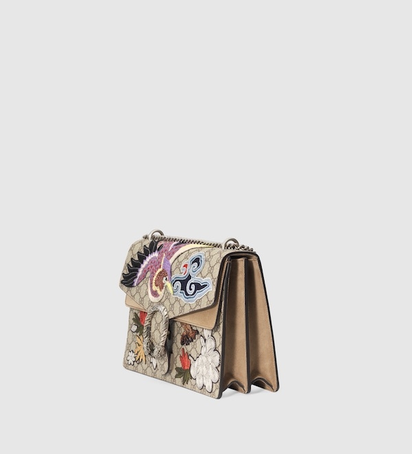 Depuis qu'Alessandro Michele est passé de la section Accessoires de Gucci à la direction artistique globale de la griffe italienne, force est de constater que les fashionistas ne rêvent plus que de double "G", de mocassins à mors et de looks à la Margot Tenenbaum. Difficile dans ce contexte de résister au savoureux clash entre la toile "suprême GG" et les broderies follement kitsch de la réédition du fameux sac Dionysus... Oui mais voilà, après vérification, il s'avère que lesdites broderies ne sont pas brodées à même le sac, mais simplement apposées sur ce dernier tels des écussons, ce qui confère à l'ensemble une dégaine un brin cheap. Dommage !