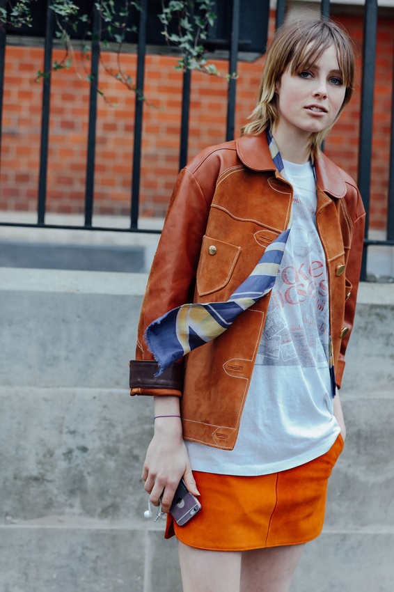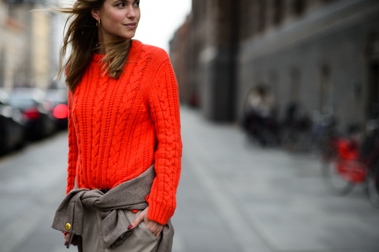 On notera ainsi que : La teinte abricot s'avère idéale pour débanaliser le duo jean/chemise blanche (voir ici). La douceur confortable de la laine torsadée sied bien à la vivacité acide de l'orange (voir ici). Nimbée de nonchalance seventies/nineties (à coup de veste en cuir marron et de tee-shirt loose), la micro jupe orange gagne ses galons de pièce facile à vivre (voir ici).