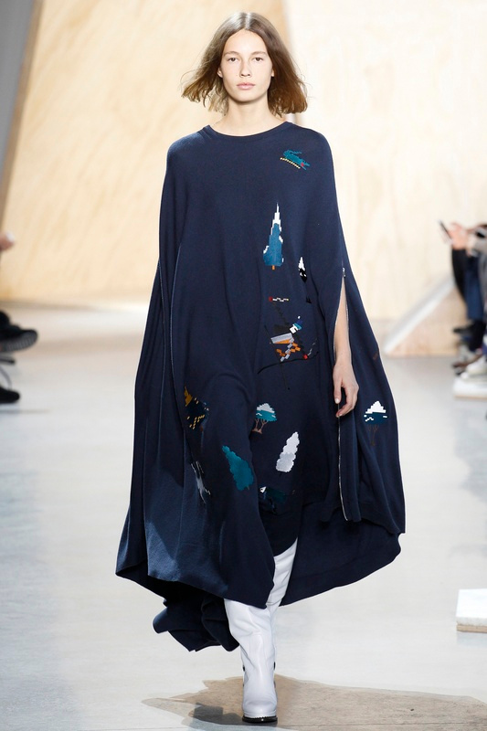 On pense notamment au mix poncho oversize en PVC réglisse/pantalon 3 bandes, dont l'allure "jet set street" apparaît idéale pour frayer avec les intempéries (tout en restant totalement "instagrammable"), mais aussi aux duos robe pull zippée sportswear/bottes cirées esprit Pretty Woman, pull-over graphique/jupe-culotte chocolat, ensemble façon jogging/manteau en shearling 2 en 1, cape XXL/broderies régressives, qui se révèlent aussi faciles à appréhender que gorgés de caractère.