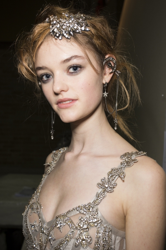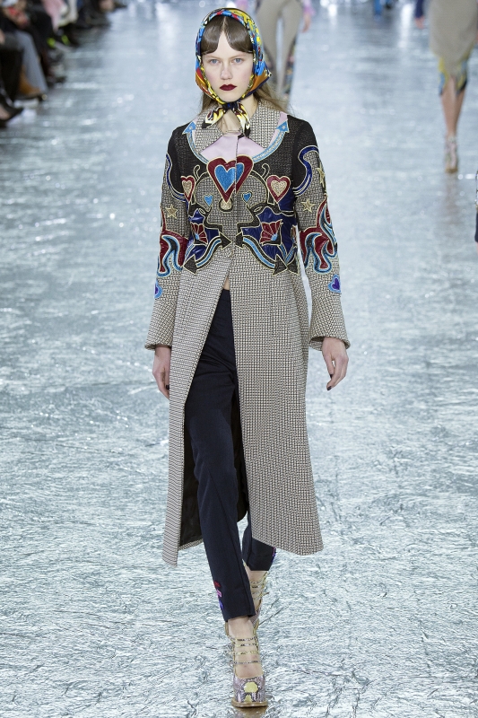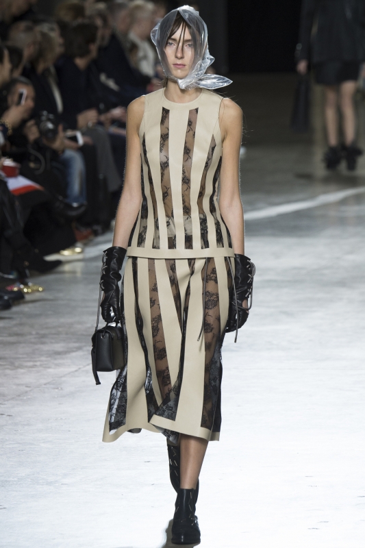 Chez Alexander McQueen, Sarah Burton ne sort pas de sa zone de confort. Et si tout s'avère beau, raffiné, joli (voire très joli), on regrette néanmoins le panache mélancolique, la subtile décadence, la fragilité grinçante, la folie à fleur d'étoffe et le mépris des enjeux commerciaux qui rendaient si singulières les collections de feu Alexander McQueen. Le bijou de cheveux se pose sur une chevelure en désordre (Alexander McQueen). Rien d'extraordinaire à signaler chez Burberry : le stylisme et les combinaisons de teintes sont honorables, mais les pièces manquent de créativité. Alors certes, les petites robes à sequins et les pardessus à carreaux se vendront fort bien, mais de là à faire rêver… Les rayures arc-en-ciel semblent avoir le vent en poupe (voir ici et là). A l'occasion de sa collection A/H 2016-2017, Christopher Kane pare ses mannequins du fichu imperméable que sa mère - décédée il y a un an - portait pour aller le chercher à l'école. Il y a quelque chose de touchant dans la facilité de Kane a tisser un vestiaire autour d'un souvenir... Chez Paul Smith, le duo carbone/orange gagne en sophistication rétro (voir ici).