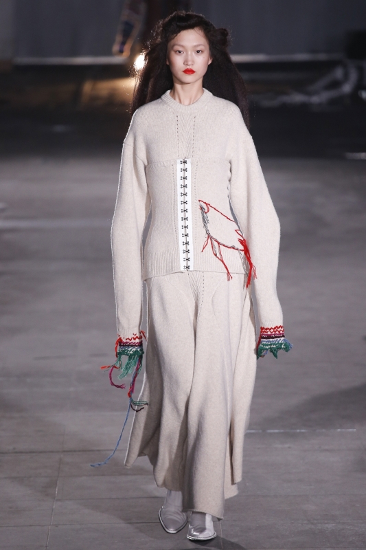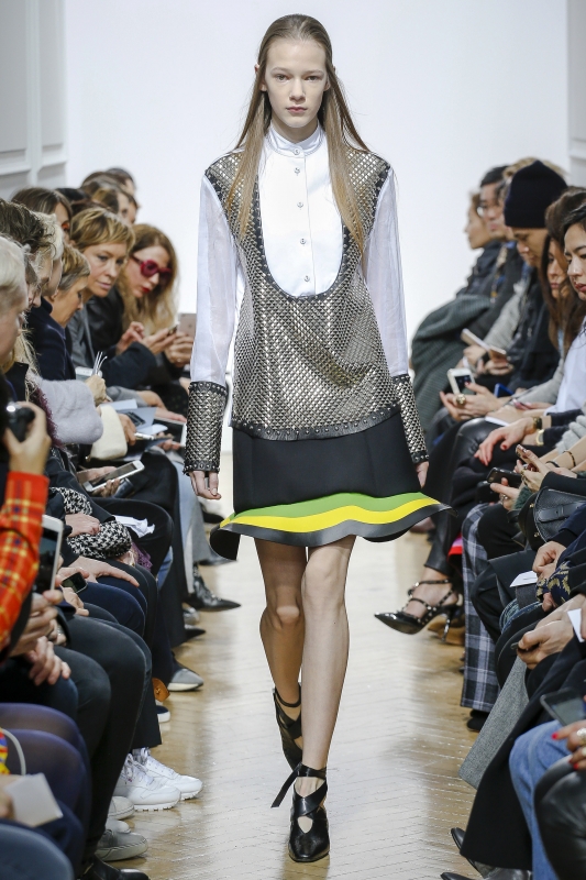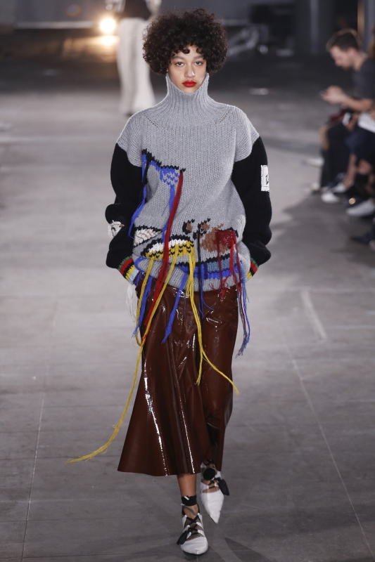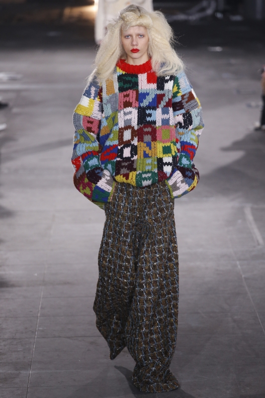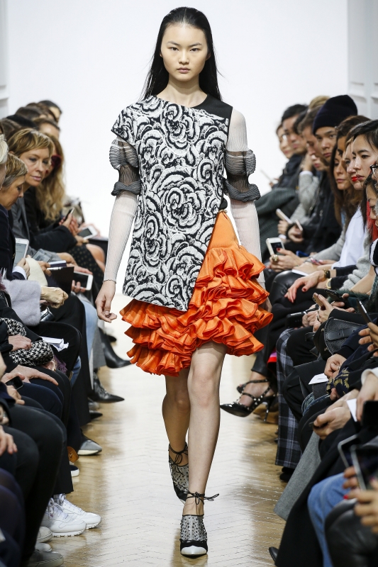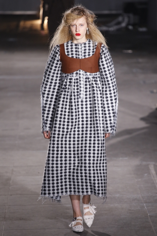 S'ils se révèlent parfaitement exécutés, les intarsias de Mary Katrantzou (ici et là) n'en exhalent pas moins un léger parfum de déjà vu. Rayures verticales et horizontales se mixent à l'envi (voir ici et là). Pour son premier défilé chez Mulberry, Johnny Coca coupe ses robes nuisettes dans des tissus lourds, les associe à des chemises en mousseline et crée ainsi un contraste intéressant. La sur-robe translucide pourrait bien devenir la nouvelle fantaisie à la mode (voir ici). Chez Simone Rocha, on sent l'influence du père de la créatrice (John Rocha), mais aussi de Yohji Yamamoto (période nineties) : le résultat est enthousiasmant, poétique et subtilement décadent. On note au passage l'usage espiègle/couture des sublimes tweeds bouclettes, que n'aurait par renié Gabrielle Chanel (voir ici, ici et là).