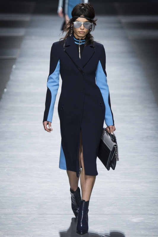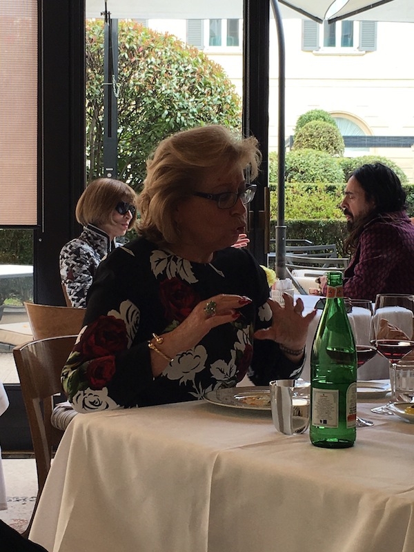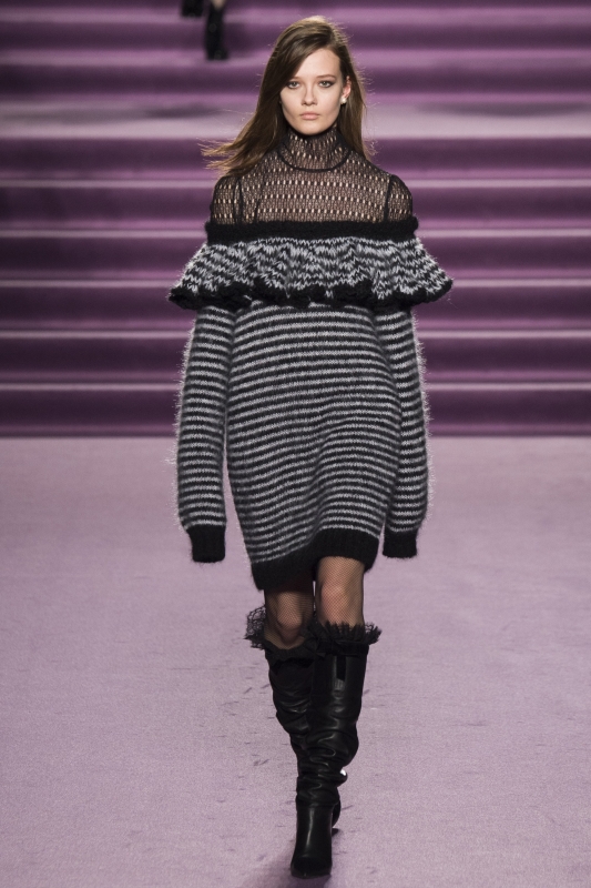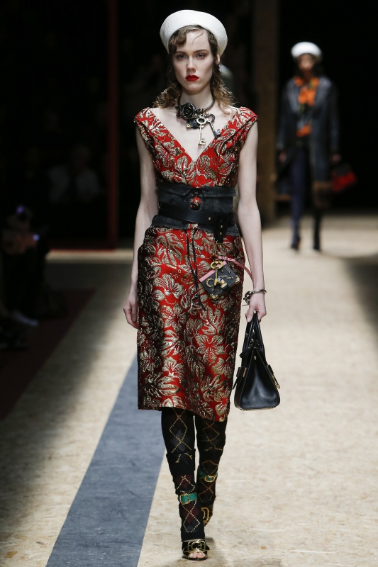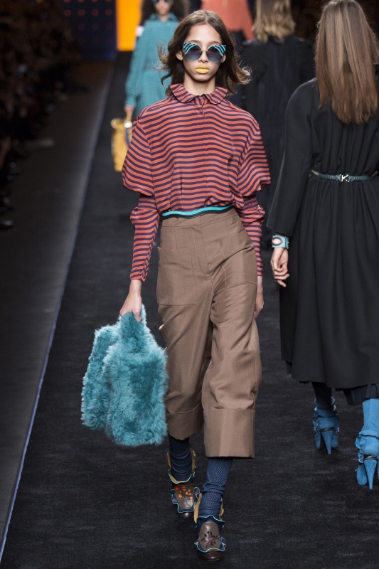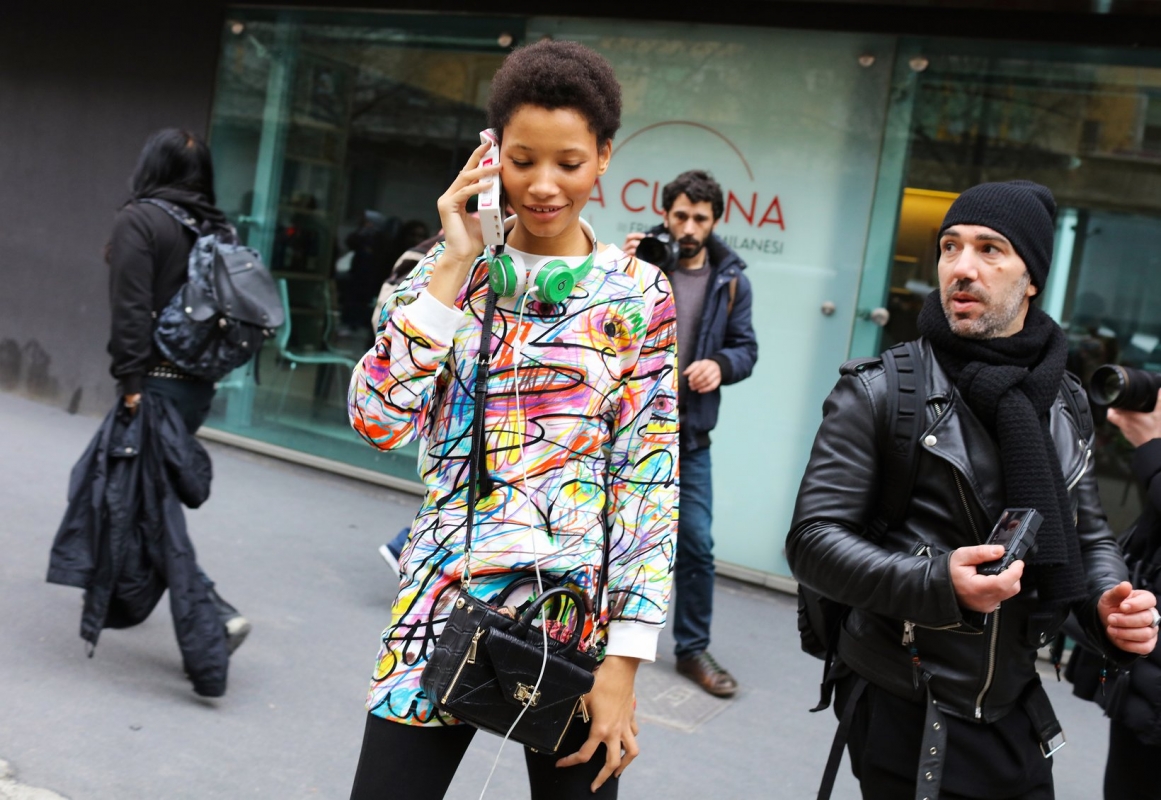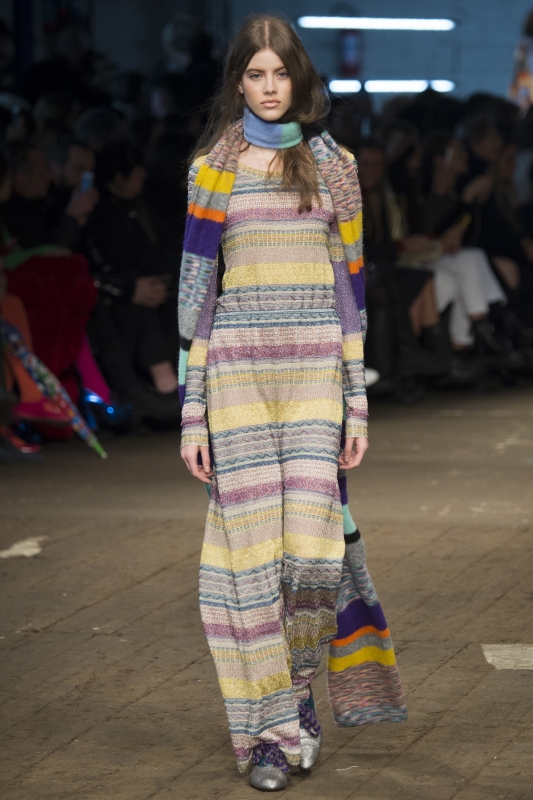 Le sportswear seventies n'a de cesse d'inspirer les créateurs (Emilio Pucci, Versace). Rose layette, orange et rouge composent un heureux trio (Emilio Pucci). On craint que la présence sur le show Marni de plusieurs pantalons fuseaux ne relance la tendance… (voir ici) Gucci sied décidément mieux aux femmes qu'aux hommes… (voir ici) En combinant texture douillette et rayures verticales colorées, Max Mara applique à la lettre la recette du best-seller consistant à mixer confort et originalité maîtrisée. Cette robe Gucci n'est pas forcément celle que l'on aurait choisie pour Anna Dello Russo… (voir ici) Chez Fendi, Karl Lagerfeld revendique une certaine légèreté d'esprit : rien ne sert selon lui de trop intellectualiser les choses. Au vu des passages joyeusement éclectiques gorgés d'énergie espiègle, de détails "Op art", de twist sixties et de fantaisie girly du show italien, on pourrait bien lui donner raison... Les cuissardes à volants Fendi ne manqueront pas d'affoler les inconditionnels du daim moulant montant haut sur la cuisse. Qui n'a pas son baggy façon croco ? (voir ici et là) Alessandro Michele a eu droit à un déjeuner en tête en tête avec Anna Wintour (merci à Alice pour la photo !) Domenico Dolce et Stefano Gabbana imaginent une robe susceptible de se substituer au Xanax (voir ici). La pièce forte du défilé DSquared2 n'a pas dû laisser indifférentes les rédactrices de mode habituées à couvrir la fashion week de Moscou… (voir ici) Alessandro Dell'Acqua livre une collection inégale : pas assez travaillées, certaines des pièces (voir ici, ici et là) de ses mix and match grunge appauvrissent la teneur stylistique de ses silhouettes. Marron et bleu azur font particulièrement bon ménage (voir ici).