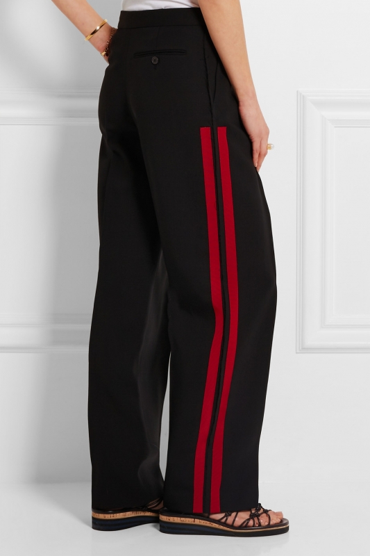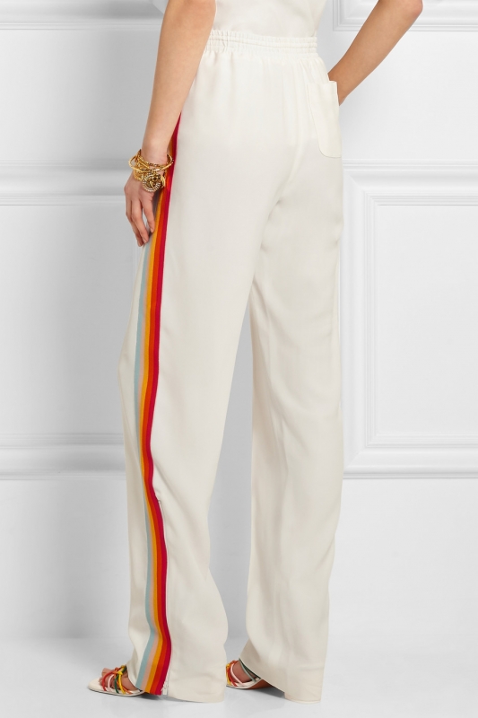 À mi-chemin entre le jogging 3 bandes et le pantalon militaire d'apparat, le pantalon muni d'une ou plusieurs bandes verticales courant le long du côté extérieur de la jambe a le vent en poupe cette saison. Fusionnant fantaisie sportswear et élégance masculine, ce dernier brille en effet par sa nonchalance étudiée. Aux modèles à l'ADN pas suffisamment twisté, on préférera des pièces totalement revisitées, à l'instar du jogging fluide Chloé paré de lignes arc-en-ciel ou du pantalon large Alexander McQueen agrémenté de bandes en gros grain rouge.