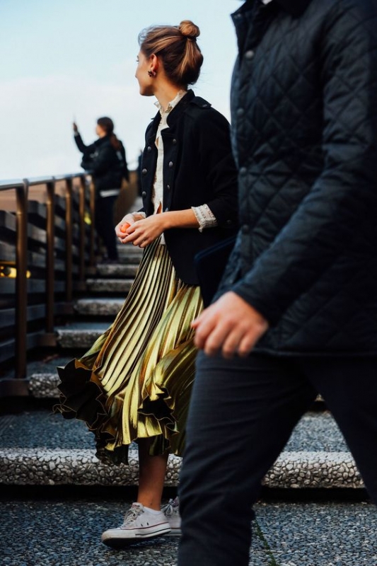 Et pourquoi pas assortir une jupe plissée métallisée à une jolie veste zippée?