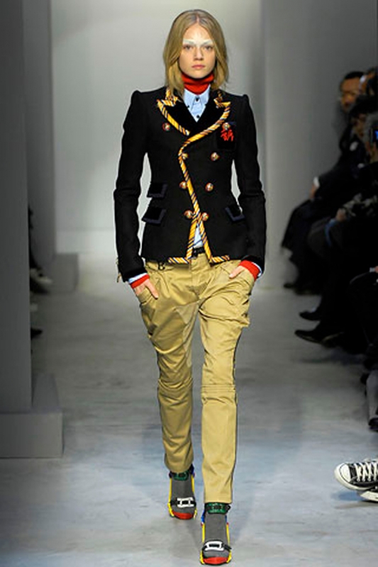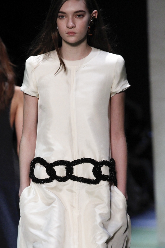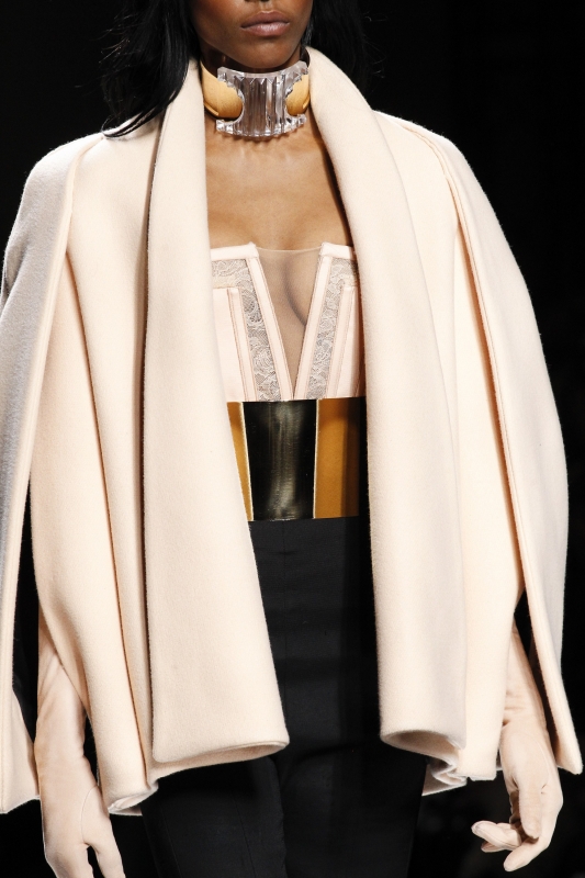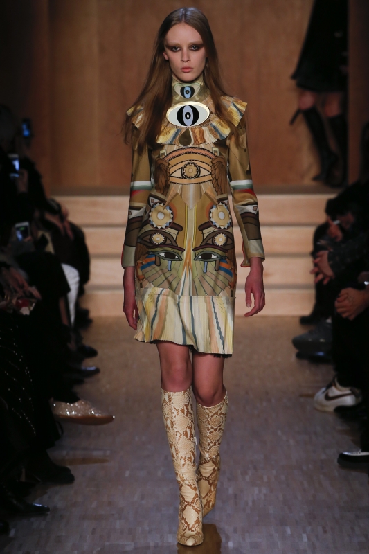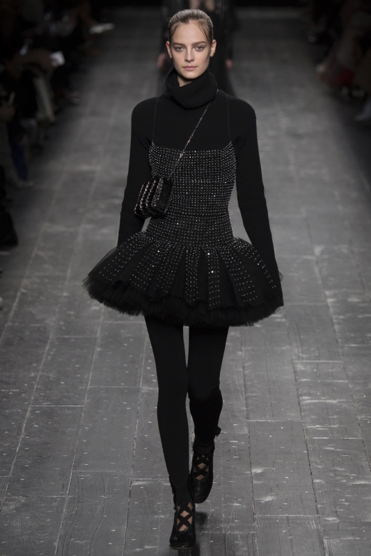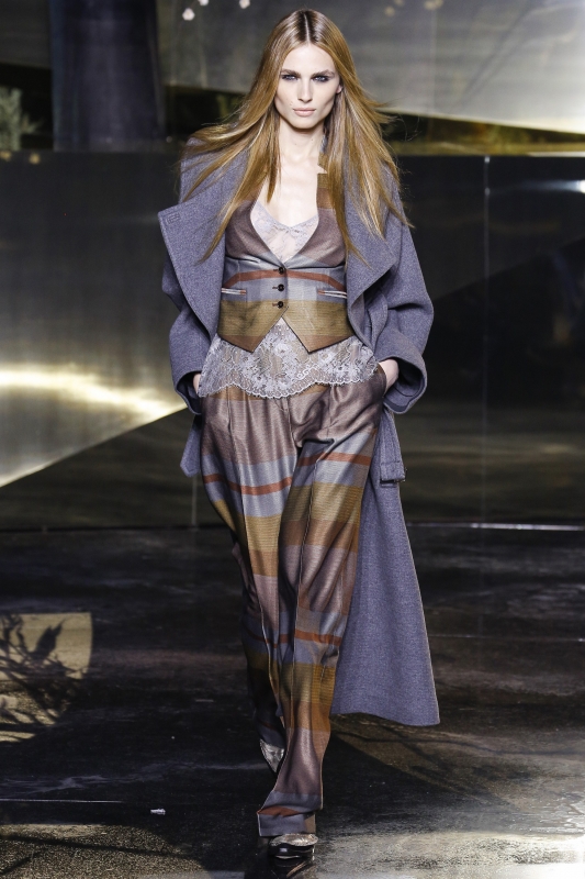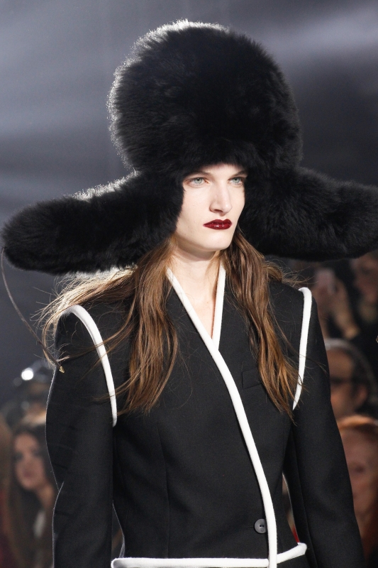 Chez Valentino, le thème de la danse est à l'honneur. Un univers auquel Maria Grazia Chiuri et Pierpaolo Piccioli n'hésitent pas à mêler influences rock et tribales, donnant alors naissance à des silhouettes tantôt gracieuses, tantôt trop littérales. Le retour de la ballerine à bout rond se confirme chez Valentino (voir ici). Chez Louis Vuitton et Saint Laurent (entre autres…), la maigreur de certaines mannequins tient de la provocation. Après quelques saisons de diète street-style, Taylor Tomasi revient sur le devant de la scène (voir ici, ici et là) Sur le podium Louis Vuitton, on découvre une "héroïne digitale" en prise avec les amours sportswear, futuristes et "sensuels cérébraux" de son concepteur. Elle se love ainsi dans des sweaters en mohair color-block (qui sont certainement déjà sur la liste de tous les acheteurs), porte ses robes tee-shirts liquides avec de longs gants réglisse, emprunte à la femme Balenciaga de 2007 sa fameuse silhouette jodhpur et a du mal à quitter ses pantalons de biker. Coupé de manière à créer une curieuse illusion d'optique, son trench laisse par contre assez dubitatif. On laissera à Anna Dello Russo la "discrète" chapka Louis Vuitton... (voir ici). Nul doute que le sculpteur César n'aurait pas renié cette malle Louis Vuitton légèrement compressée (voir ici). On verrait bien les maîtres nageurs de Malibu beach troquer leur sacoche de premier secours contre un sac Louis Vuitton... (voir ici)