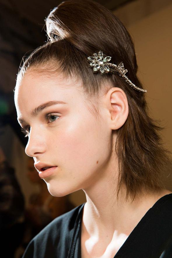 Sa tenue de mariage : Elle se glissera avec délice au sein d'une robe bustier bleue qu'elle accompagnera d'escarpins jaunes et d'un mini sac de la même teinte. Pour sa coiffure, elle s'inspirera du hair code Prada P/E 2016 en retenant sa queue de cheval haute par cette barrette.