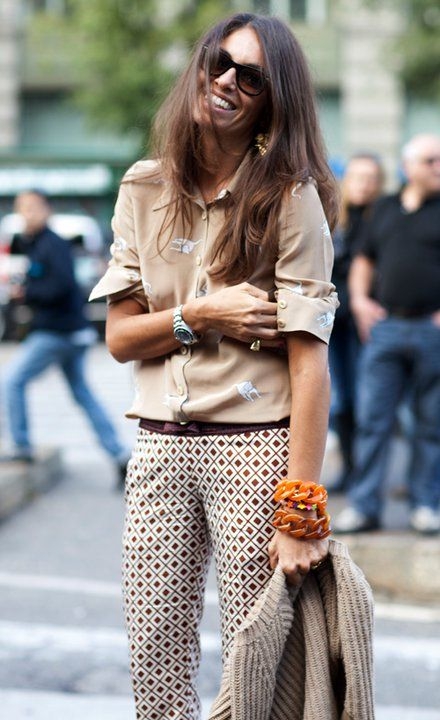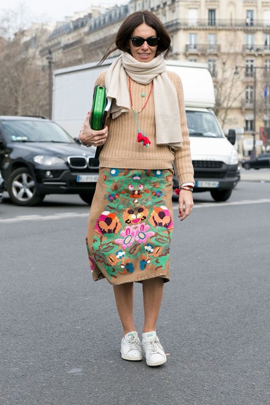 Associer un imprimé vichy Bardot à des tonalités caramel (voir ici). Apaiser le caractère flamboyant d'une ample jupe aux imprimés éthiques en la mariant à un top casual (voir ici et là). Associer une teinte pastel à sa jumelle déclinée dans une tonalité plus vive (voir ici). Twister l'allure dadame d'une jupe midi fleurie en la réchauffant d'un sweat-shirt (voir ici). Permettre à une jupe de soirée de voir le jour en lui mixant pull sage et souliers plats (voir ici). Surmonter une simple petite robe type baby doll d'une ample et longue blouse (voir ici). Réchauffer le duo jean/chemise en denim au contact de pièces tabac et marron (voir ici). Dédramatiser ses longs manteaux en fourrure en les portant à plat, accompagnés d'un bandana porté en collier lâche et d'une veste en jean ou d'un gilet dont elle laisse dépasser les manches (voir ici et là). Réveiller un total look monochrome en chaussant des souliers de caractère (voir ici et là). Miser sur des volumes maîtrisés lorsqu'elle désire porter un all-over d'imprimés (voir ici).