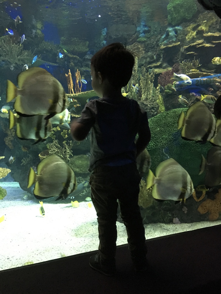 La photo de la silhouette de Charles devant les poissons colorés est très belle ! et aussi oui, maman met des pantalons, la vérité sort de la bouche des enfants...