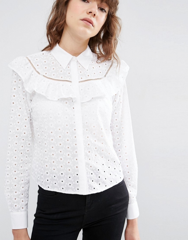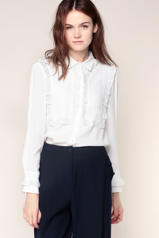 Les blouses aux poignets volantés gagneront à laisser ces derniers dépasser des manches d'un épais gilet, d'un blazer ou d'une chemise en jean. Plus la chemise ou le top se voudra délicat, plus il sera pertinent de télescoper ladite pièce avec un bas issu d'un autre champ lexical. On pense tout particulièrement au jean mom, au bas de jogging ou encore au large pantalon masculin en flanelle. Les volants siéent bien à chemise en jean (Stella McCartney). Plus la chemise/blouse sera féminine, plus la jupe qui l'accompagne se plaira à être austère. Les cols de chemises parés de volants feront le miel des simples pull-overs col rond. Les tops aux volants complexes seront idéaux pour relever un sobre pantalon de ville carbone. Décliné dans une matière délicate, le col façon Pierrot peut se révéler très élégant.