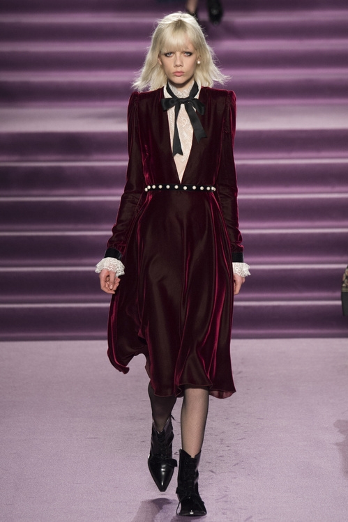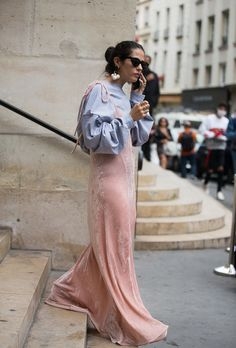 En cette saison A/H 2016-2017, la tendance "velours" suit deux courants bien distincts. Le premier, le plus classique, convoque la dimension ultra chic de cette matière à l'élégance surannée. C'est ainsi que chez Valentino les robes délicates en panne de velours se multiplient et trouvent preneurs auprès des beautiful people (voir ici et là), tandis que chez Alberta Ferretti c'est un costume rose poudré qui, porté à même la peau et accompagné d'une paire de sandales vertigineuses, se mue en une insolente tenue de soirée.
